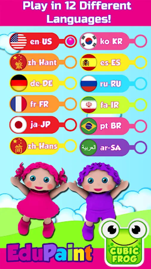 (Cubic Frog®) is proud to be a global and multilingual kids educational company with apps offering 12 different language options: English, Spanish, Arabic, Russian, Persian, French, German, Chinese, Korean, Japanese, Portuguese. Learn a new language or improve on another!
