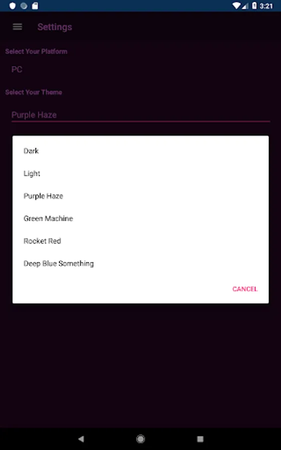 Small settings screen provided to allow you to select your platform (PC, PS4, Switch, XBox) to determine which Warframe API it uses for the challenges, fissures, bounties, and sortie data.