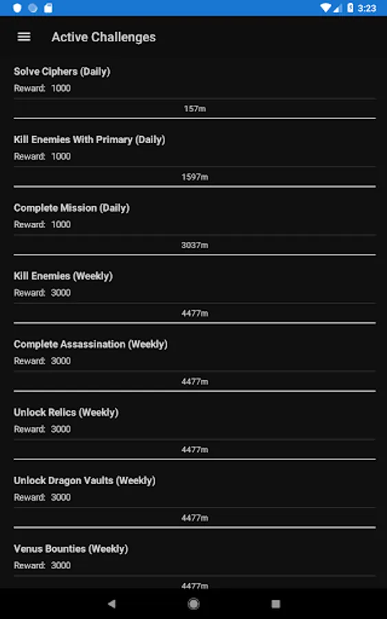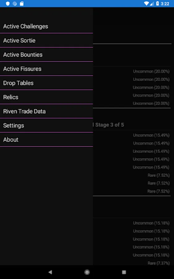 Pulls data from the Warframe Worldstate API to provide a listing of all of the active challenges, fissures, the current sortie, and a searchable/filterable list of active bounties ( can search by name, location, or a specific reward).