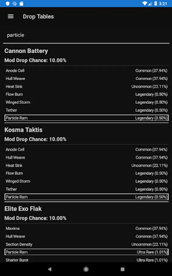 In addition to the relic data, it has a fully indexed list of the drop table data that you can filter and search by name or reward to find where that elusive mod drops in the Warframe universe.