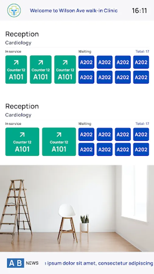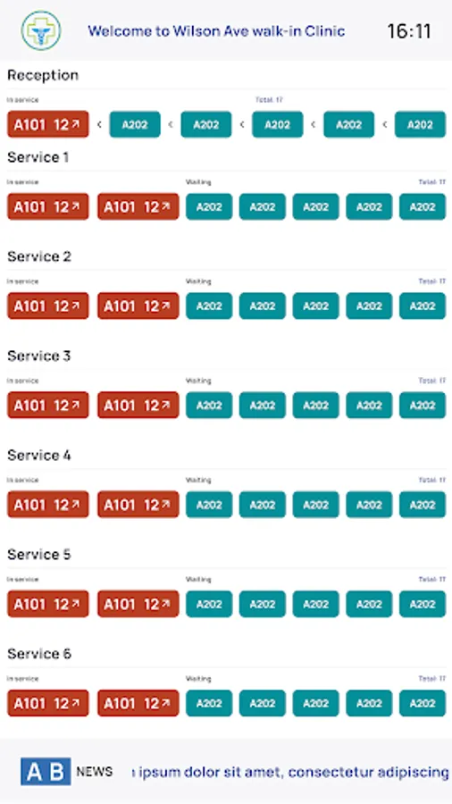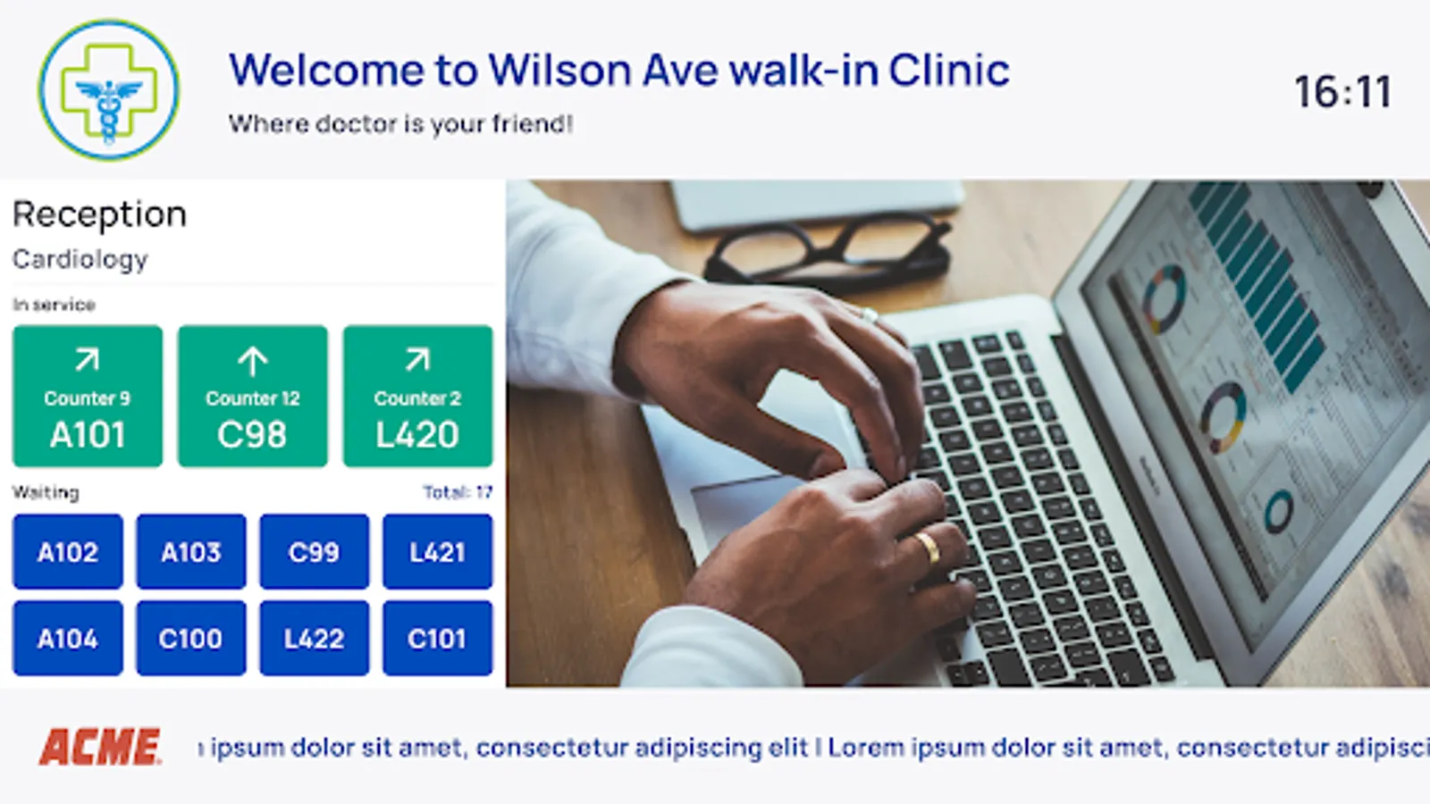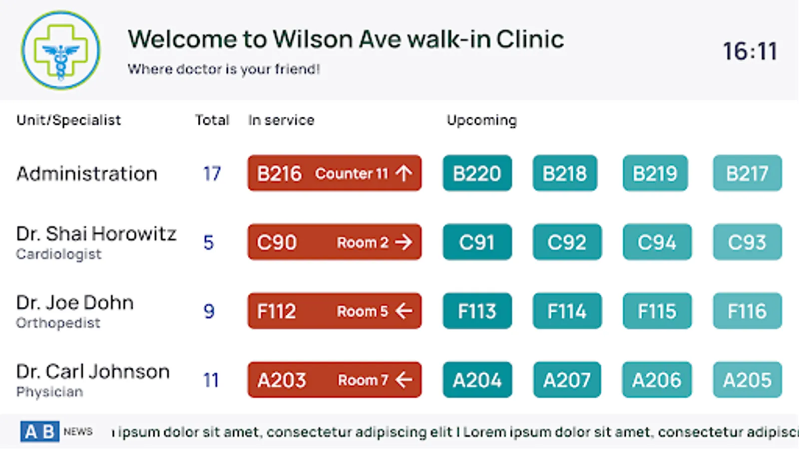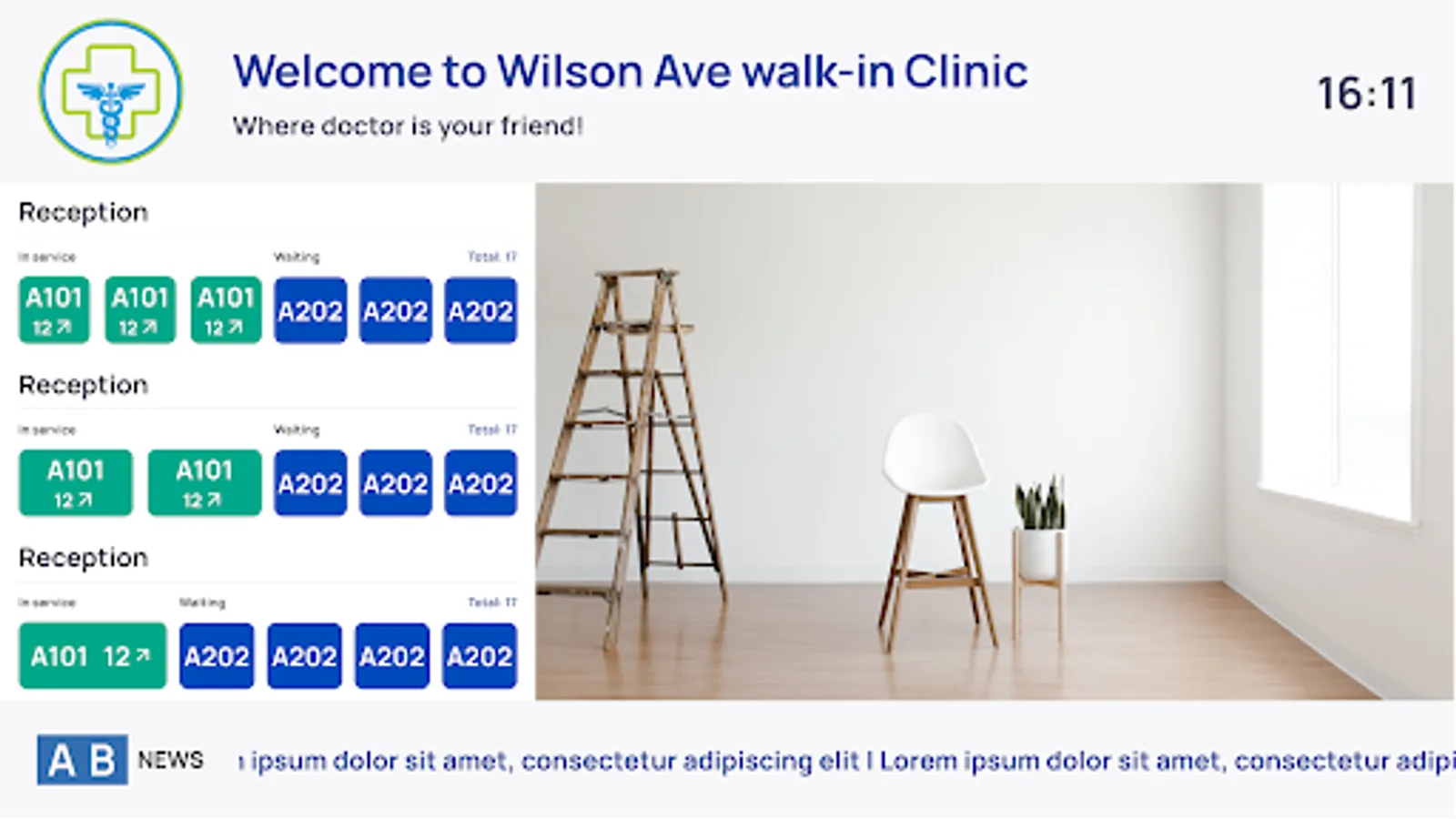 Provide real-time queue status, and broadcast curated playlists of videos, slides, and messages.