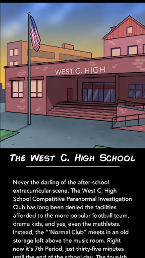 ‘Normal Club is an investigation adventure in which you build (and play as) a team of three members of the West C. High School Competitive Paranormal Investigation Club as they investigate a big scoop and try to beat their academic rivals.