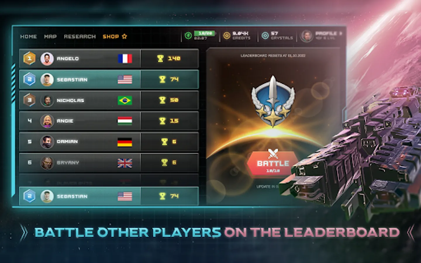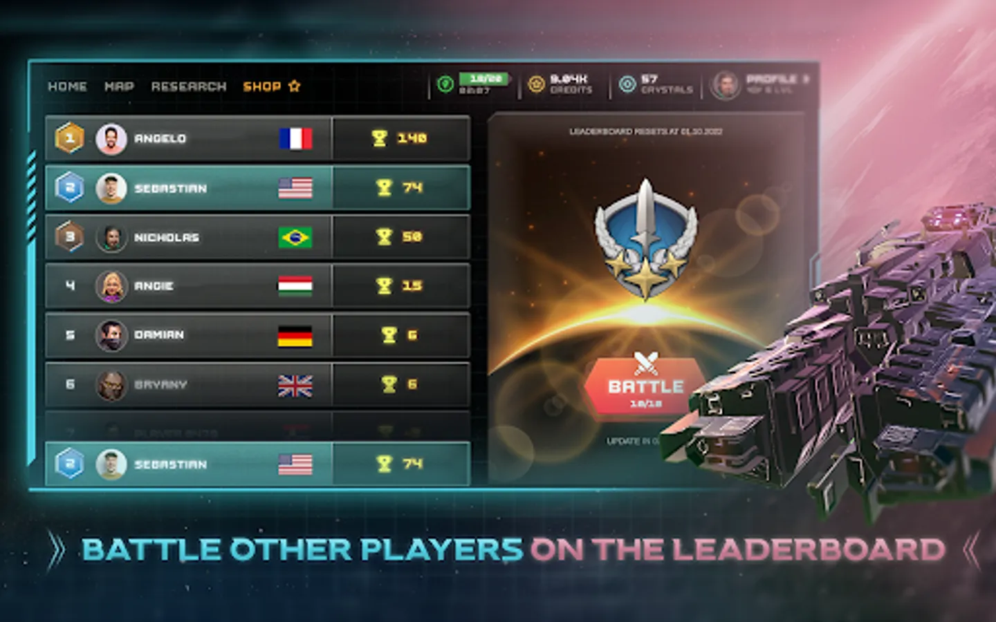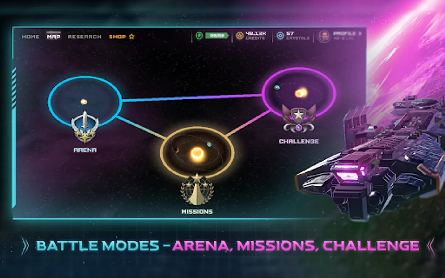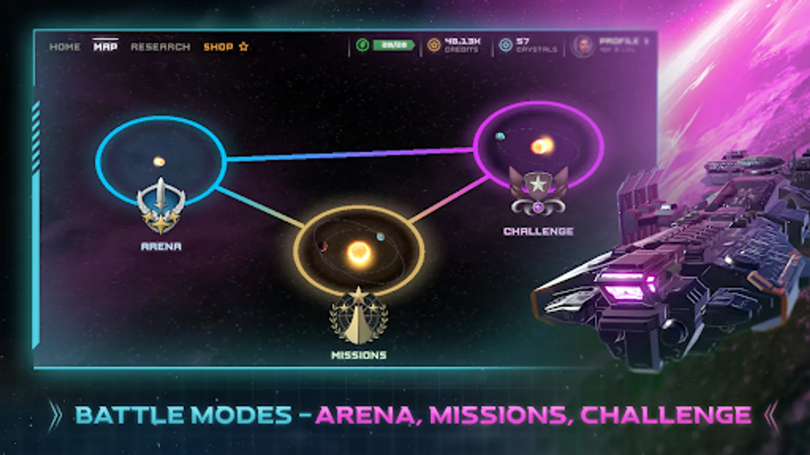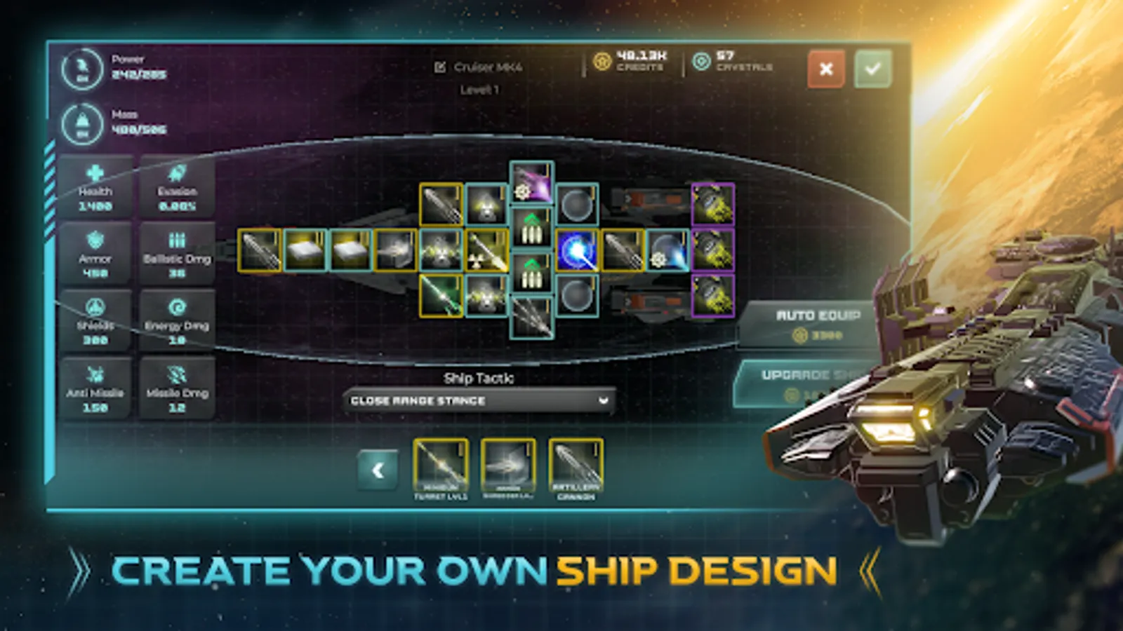 Build & customize each spaceship to help you win battles. Strategize of how you would like each spacecraft to function. Equip your spaceship for Close Range Stance, Medium Range Stance, or Long Range Stance.