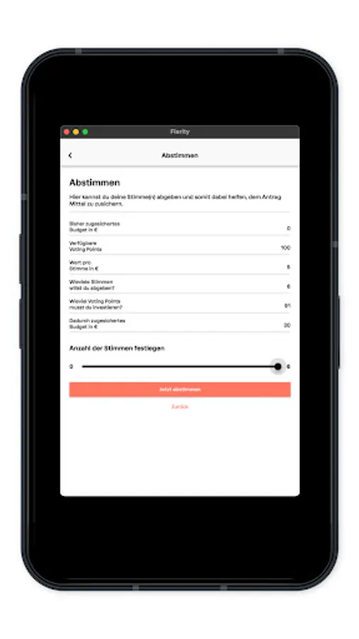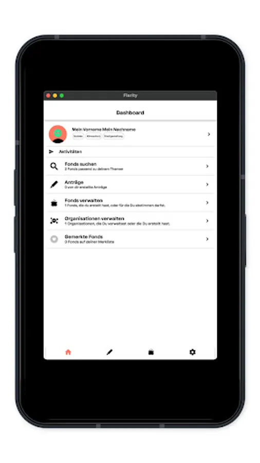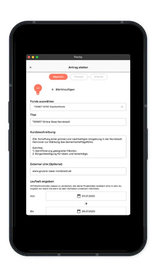 Applicants can find funding funds on the app and can submit their project applications directly in the app. You will be notified as soon as your application is accepted or rejected. If they are part of the decision-making group (optional), they can also vote for their application themselves (e.g. in a district fund). Fund management is also planned, with which the promised funds can be processed directly via the app (wallet).