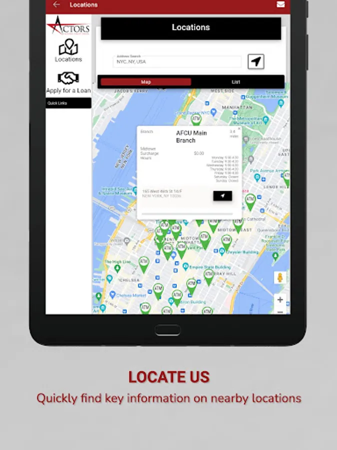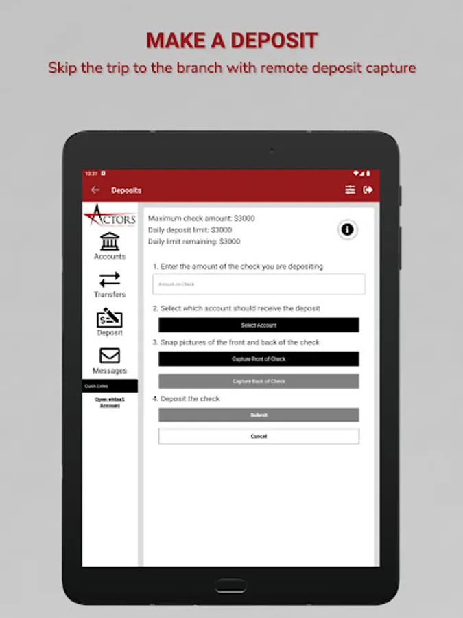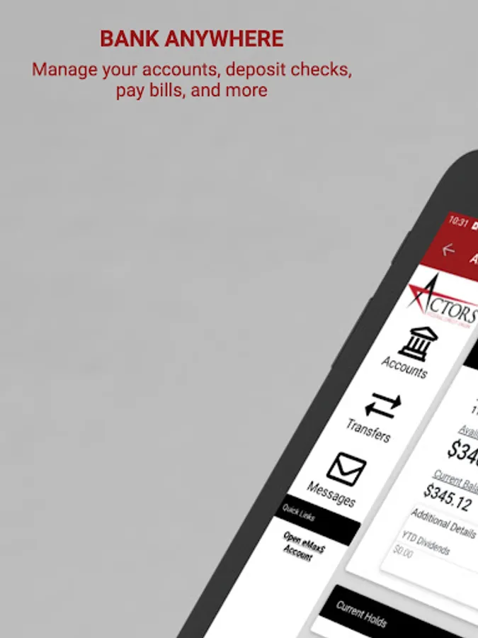 ActorsFCU's app can keep pace with your busy life. Find a branch, an ATM, make a deposit, check your account & credit card balances, pay your bills, transfer between your accounts, view eDocs or secure message one of our team members when you have a question. Access is quick, convenient, secure and allows you to do it all from your smartphone or tablet: Make instant account transfers, view account balances, withdrawal funds, deposit checks, pay bills, view your account statements and more with just a few quick taps. Sign-in quickly and securely using facial recognition, fingerprint authentication, and/or a 4-digit passcode.