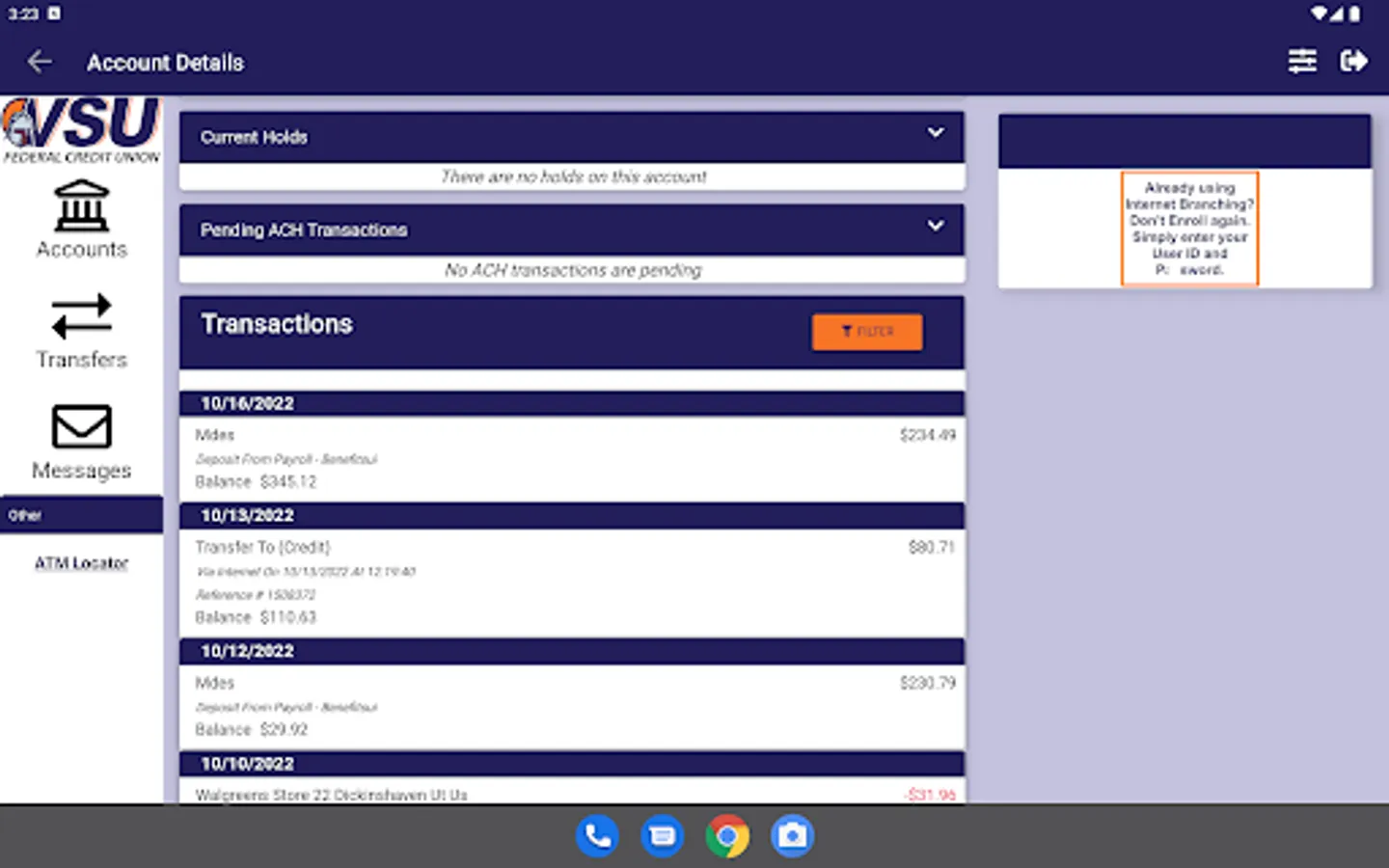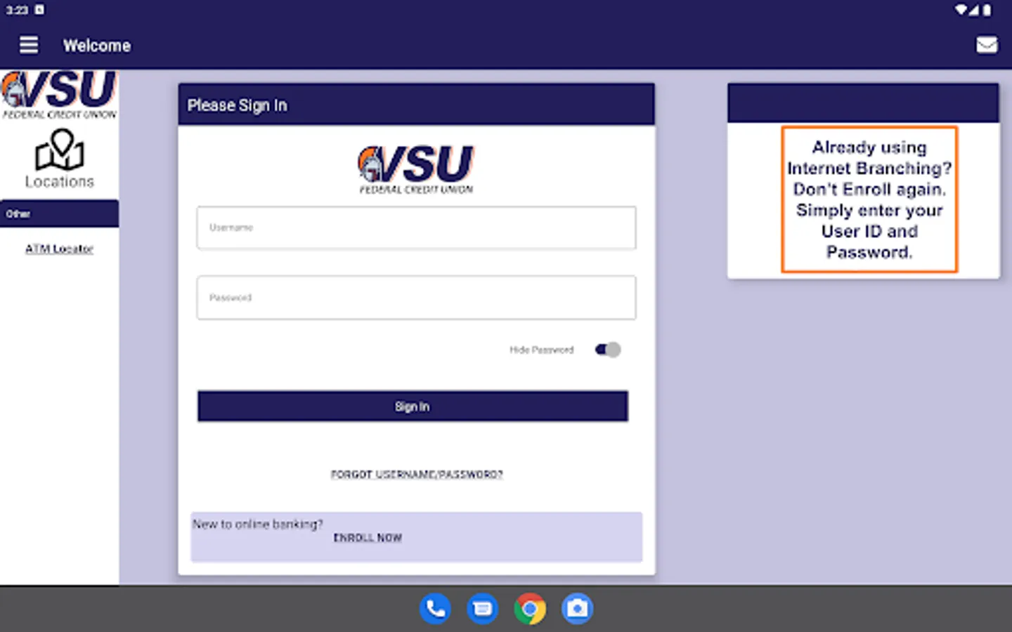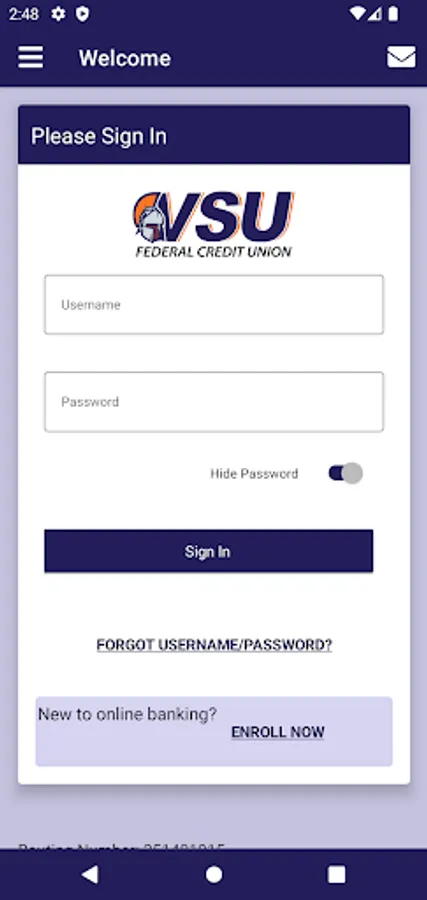 • To sign in to mobile banking, use your VSU FCU Online Banking username and password. If you have not established these yet, select "Enroll now" to get started.