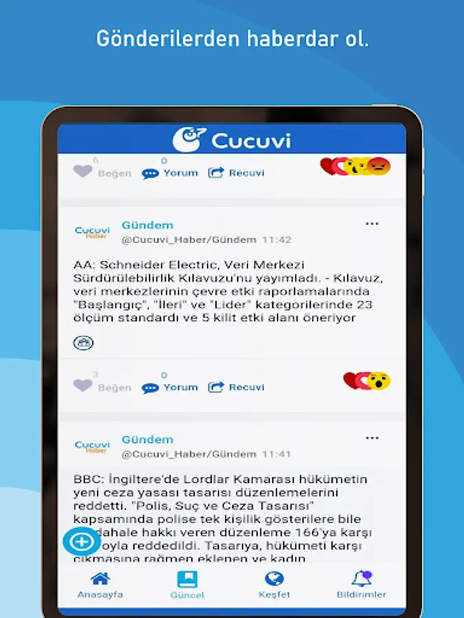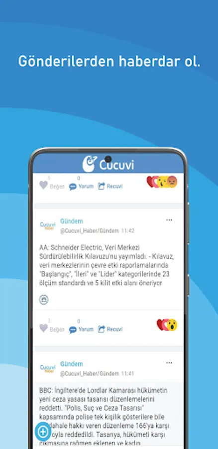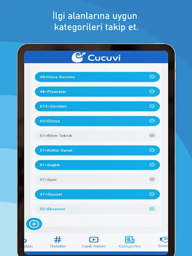 Current news can be followed live. Data from various news sites are shared instantly in Cucuvi News accounts. It offers the opportunity to follow news in areas of interest by selecting categories such as agenda news, Science Tech, Health, Politics, Economy, World news, Sports news. Weather and current exchange rates can be followed instantly.