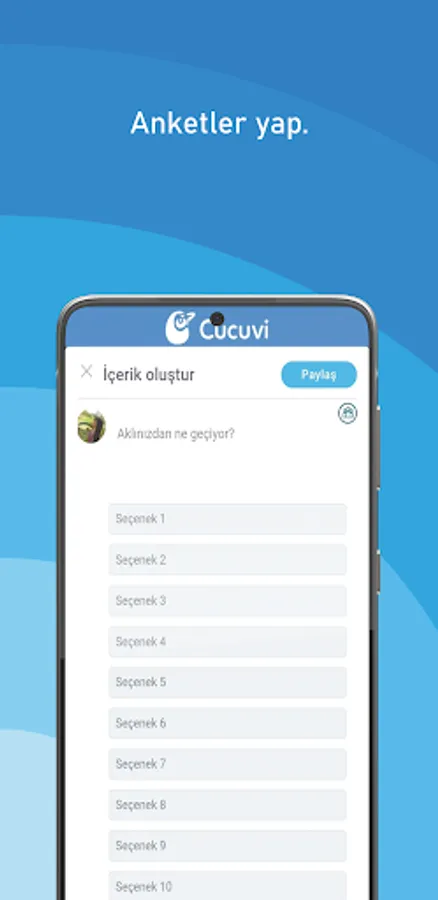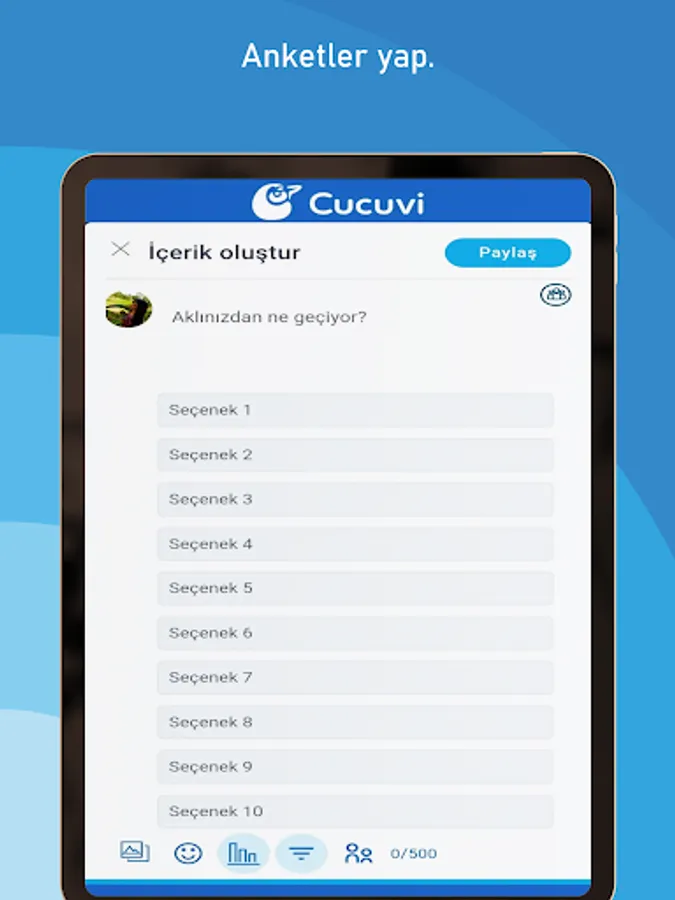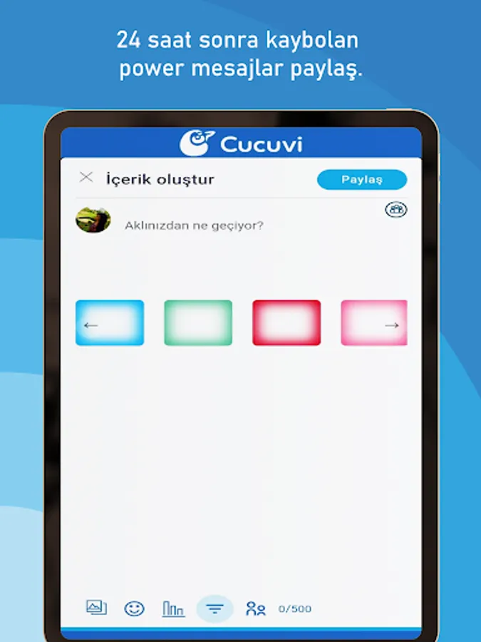 Text shares are supported up to 500 characters. Shares can be highlighted with color frame options and the frame does not disappear for 24 hours. With the support of multiple survey options, 10 different options can be added to the surveys.