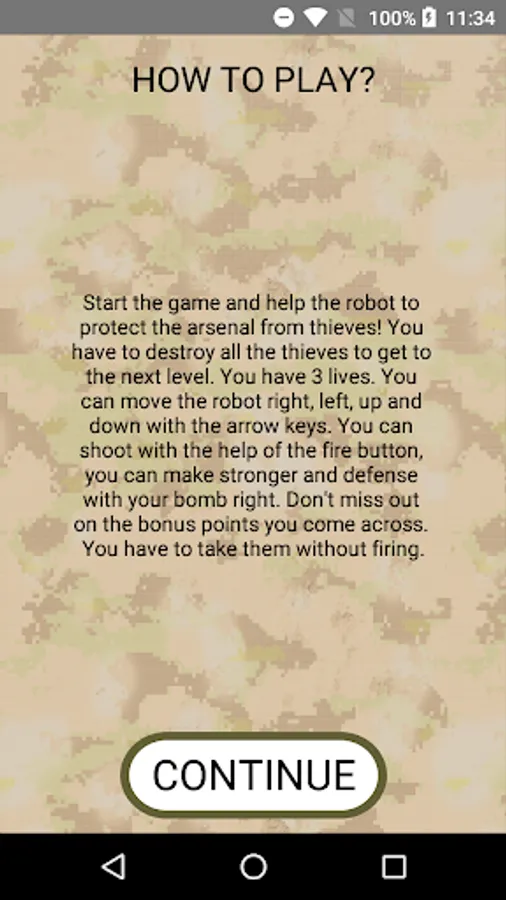 Start the game and protect the arsenal from foreign soldiers. You have to destroy all the alien soldiers to move on to the next level. You have 3 lives. You can move the robot right, left, up and down with the arrow keys. You can shoot with the help of the fire button, you can make a stronger defense with your bomb right. Don't miss out on the bonus points you come across. You have to take them without firing.