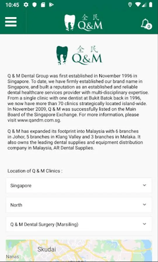 Q & M Dental Group was first established in November 1996 in Singapore. To date, we have firmly established our brand name in Singapore, and built a reputation as an established and reliable dental healthcare services provider with multi-disciplinary expertise. From a single clinic with one dentist at Bukit Batok back in 1996, we now have more than 70 clinics strategically located island-wide. In November 2009, Q & M was successfully listed on the Main Board of the Singapore Exchange. For more information, please visit www.qandm.com. Q & M has expanded its footprint into Malaysia with 6 branches in Johor, 5 branches in Klang Valley and 3 branches in Melaka. It also owns the leading dental supplies and equipment distribution company in Malaysia, AR Dental Supplies.