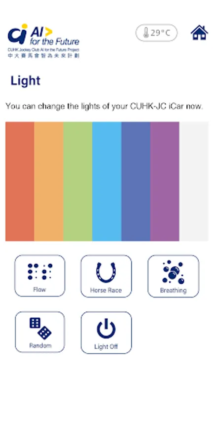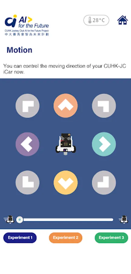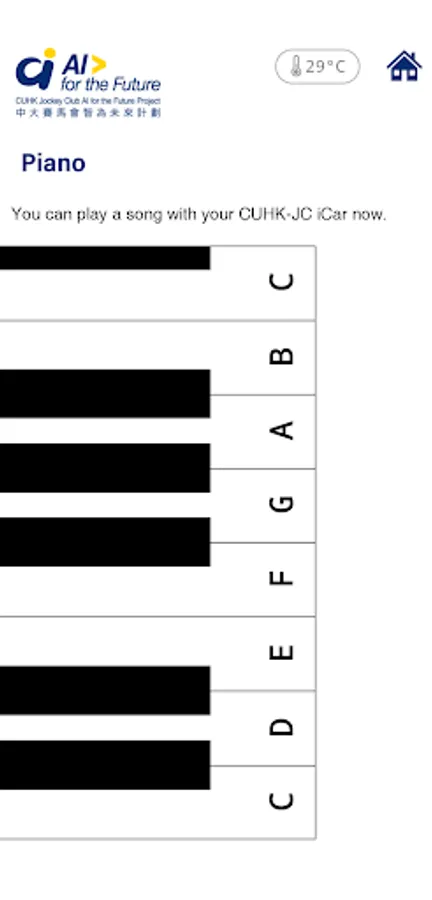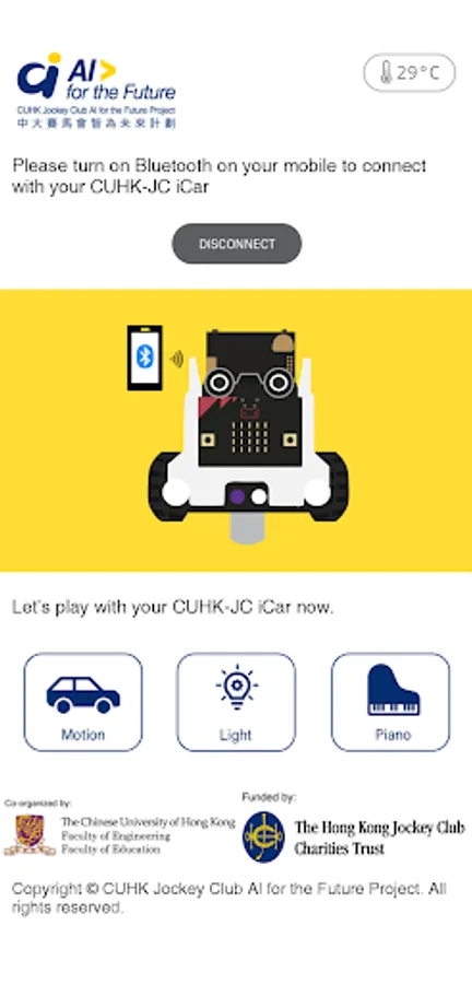 Through this application, users can connect their mobile to CUHK-JC iCar by Bluetooth without programming. The application can control CUHK-JC iCar’s movement, light effect and sound effect through keyboard inside the application. Users can also carry out 3 experiments including obstacle avoiding, object tracking and line tracking through the application.