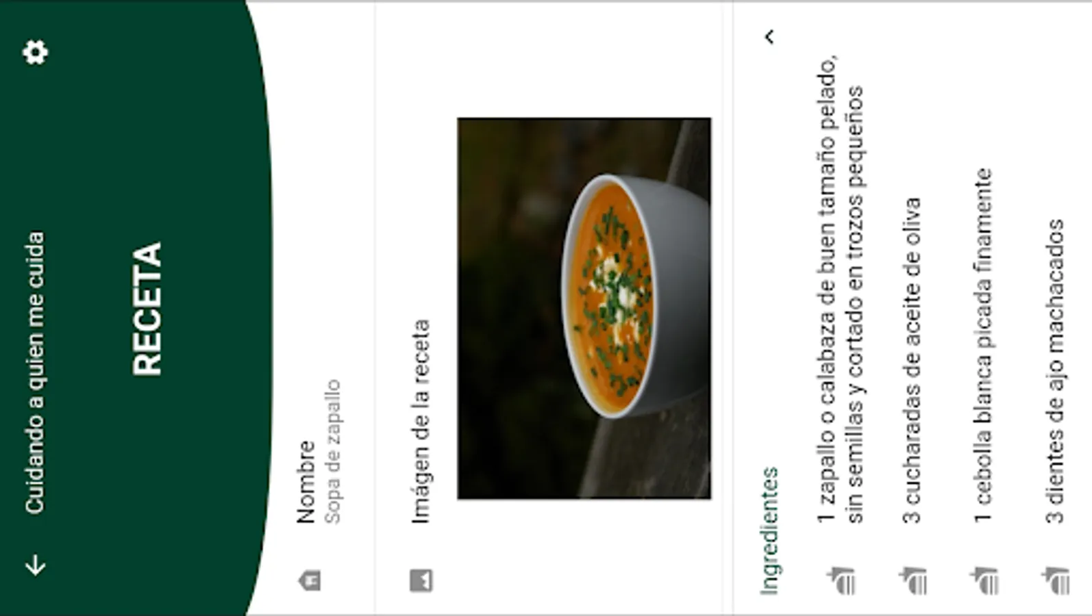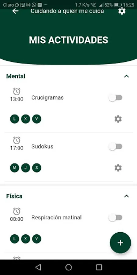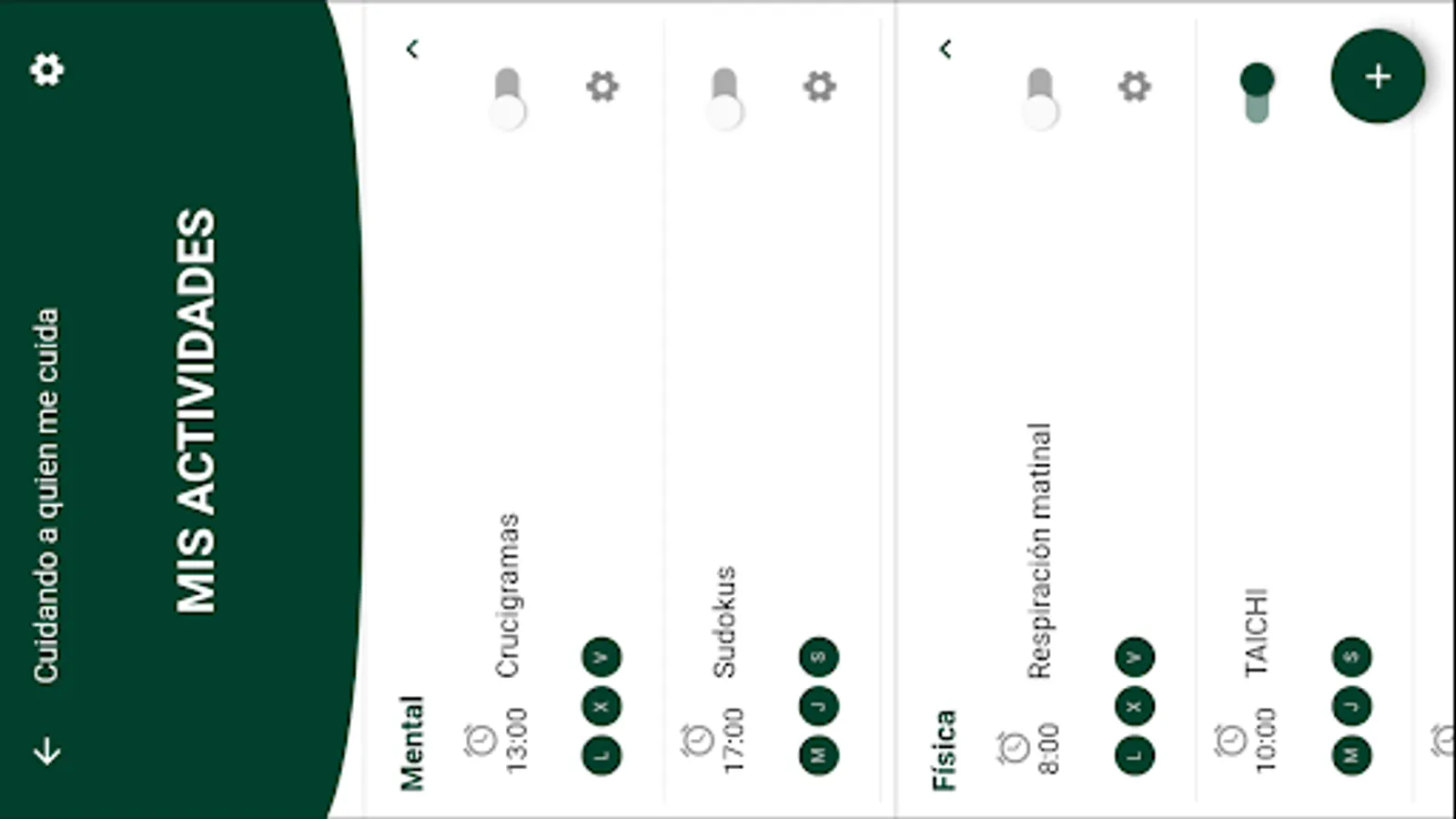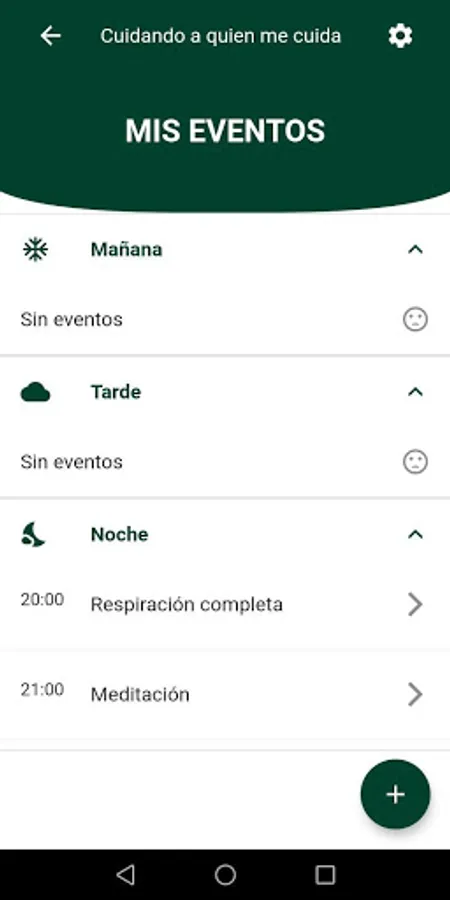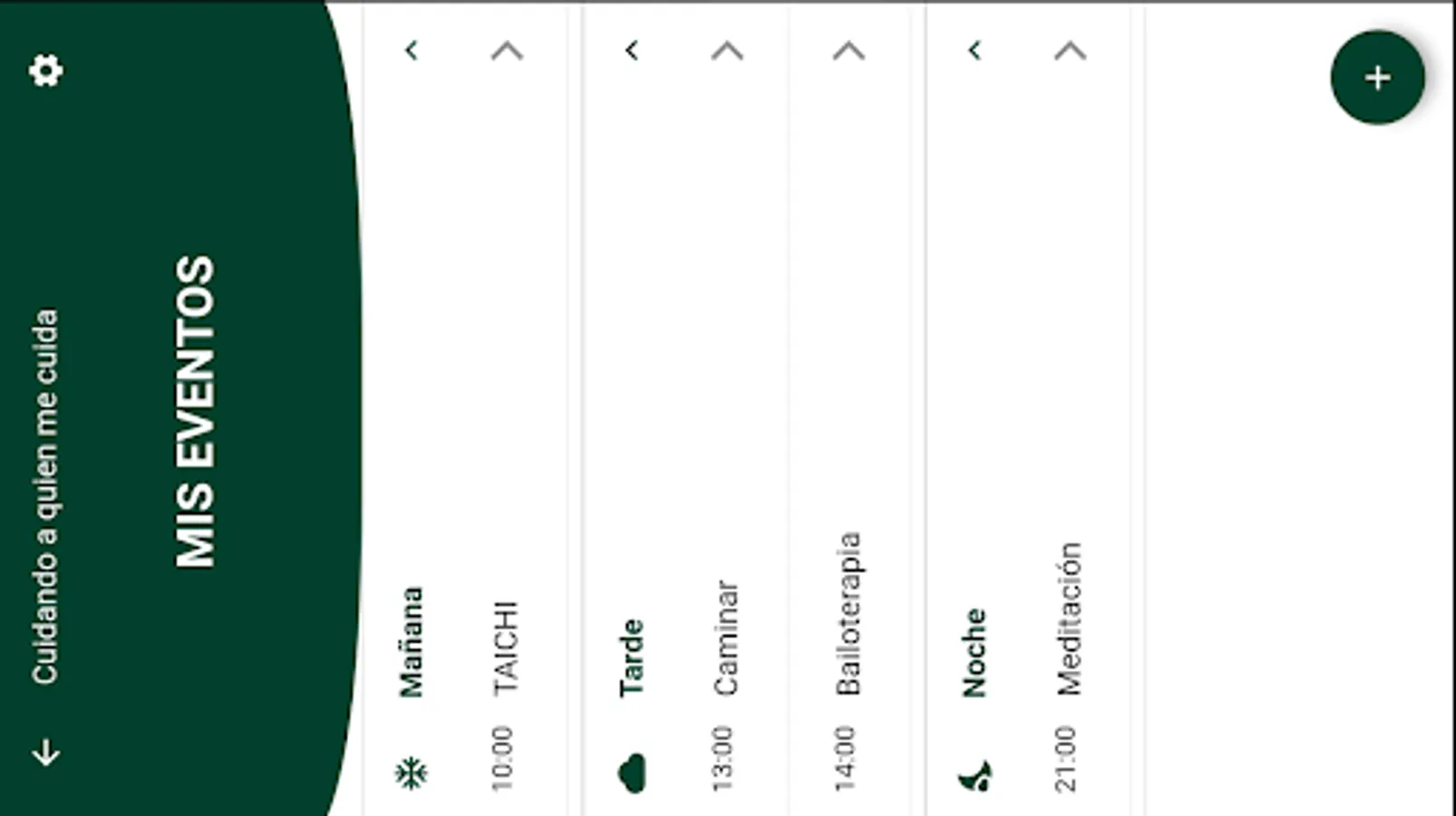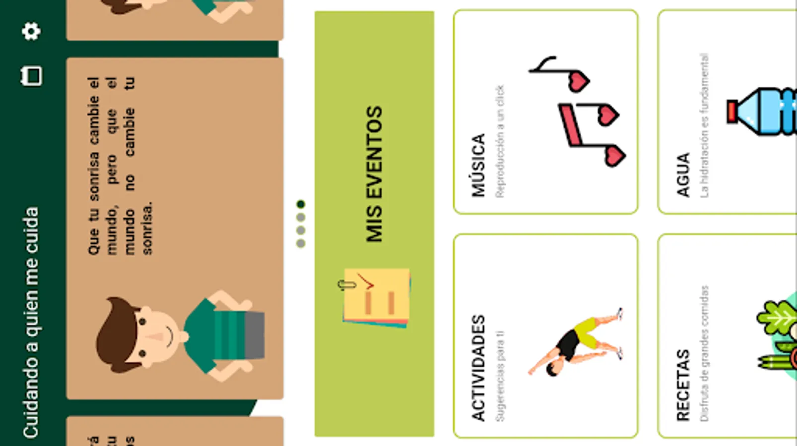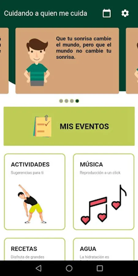 Caring for those who take care of me is an application that helps the caregiver to keep track of their daily routines, healthy meals and the correct consumption of water. Its main objective is to reduce the stress of caregivers, for this a playlist has been added with relaxing songs, activities such as yoga, meditation, Tai Chi, among others.