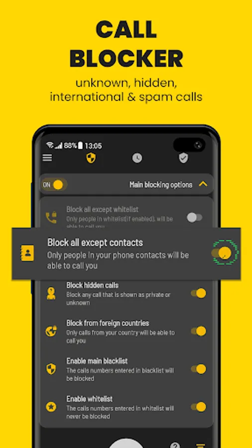 - Enable whitelist to avoid blocking your favorite contacts/numbers