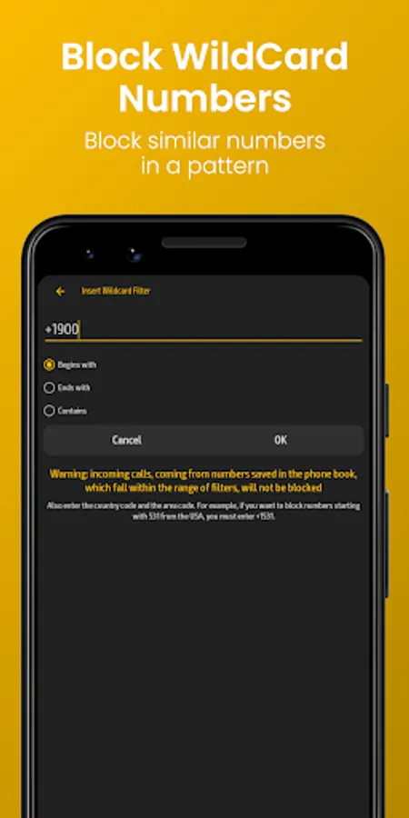 - Block wildcard numbers in patterns, starting or ending with a particular series of numbers or block numbers by country code.