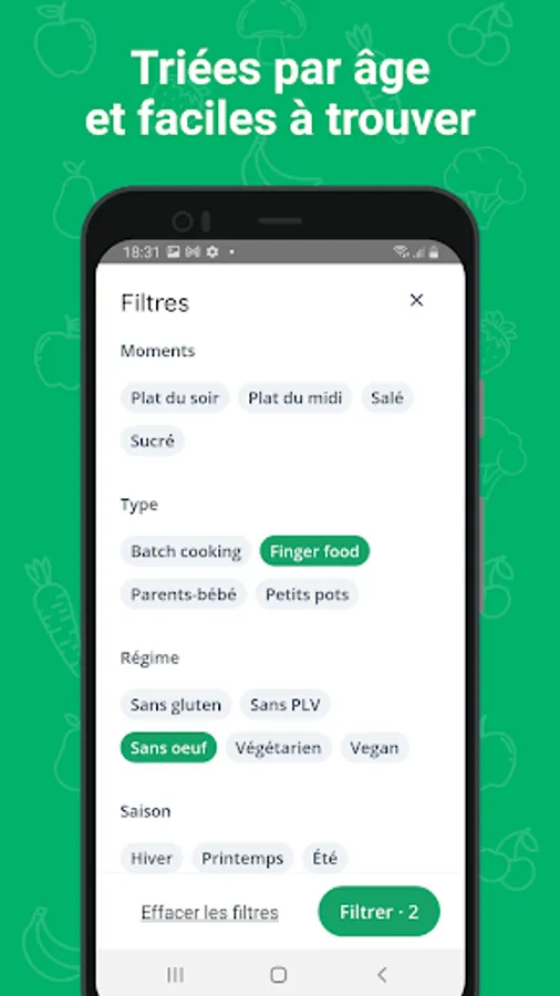 - Sort and filter recipes by age, by type, by diet (without meat, without PLV, without egg etc.).