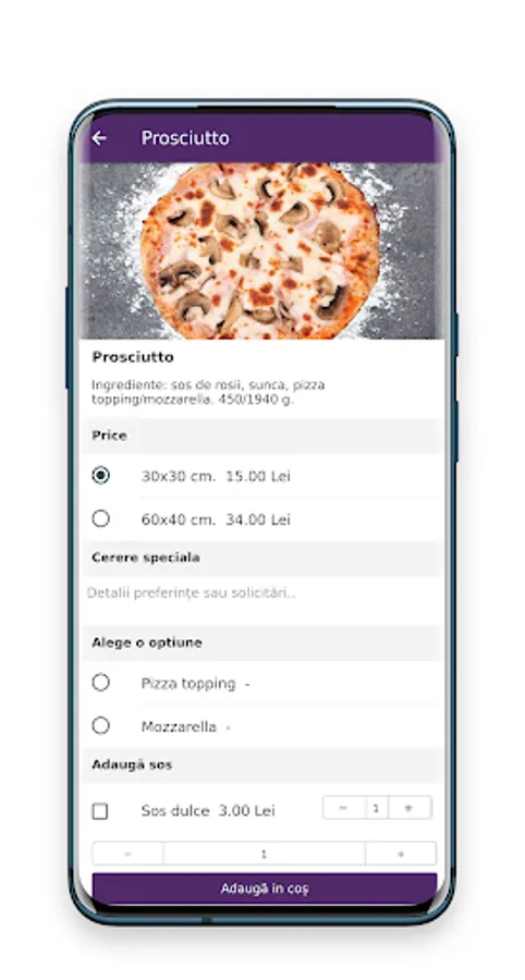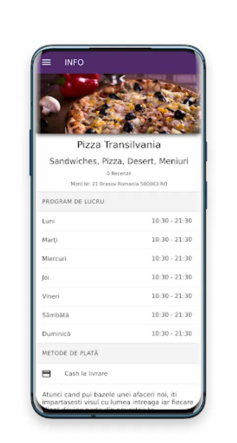 When I opened the pizzeria I had an idea and the desire to deliver to the Brasovians a hot pizza only good for their meal. We have evolved step by step thanks to the orders received and our employees who do everything with passion. Now we find in our menu fresh salads, full of vitamins or complete menus, spicy or less spicy, perfect for a decent lunch. We added new pizza recipes to cover different tastes and introduced a dessert to make your meal sweeter. We like what we do and always prepare with each delivery.