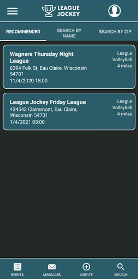 Search for events with a sport type in a specified area. IE Volleyball in the 54703 area.