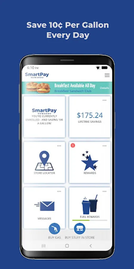 The SmartPay Rewards app is a convenient way to save 10¢ per gallon on gas, every day or pay for in store purchases. To make your visits even more rewarding, every time you use the app you will earn progress towards earning free drinks and food.