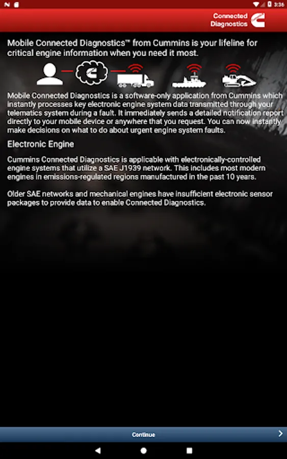 Mobile Connected Diagnostics will operate with commercial Cummins electronic engines and Cummins Agility Natural Gas fuel systems in on-highway, off-highway, marine and power generation applications and is NOT currently compatible with Dodge, Ram or Nissan OEM pick-up truck system electronics.
