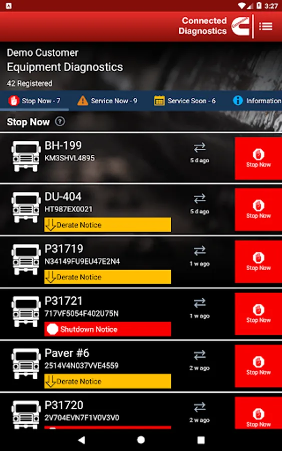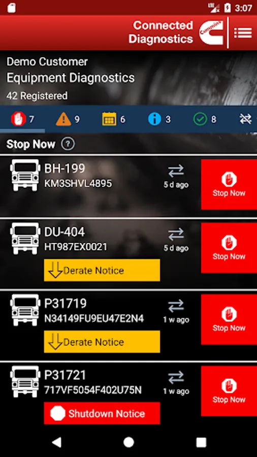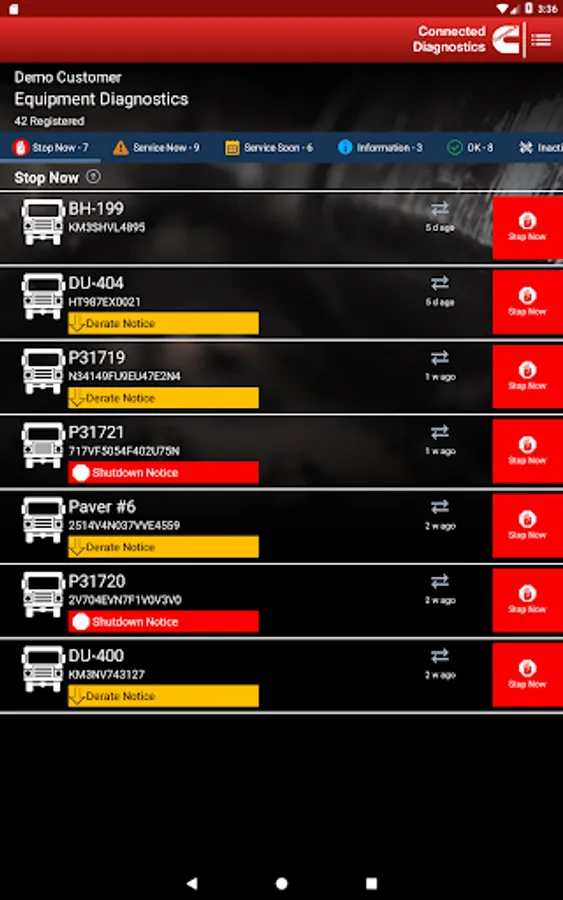 • Search functionality by VIN, ESN, Equipment ID, fault status or Cummins engine model.