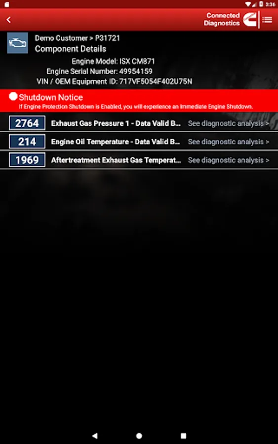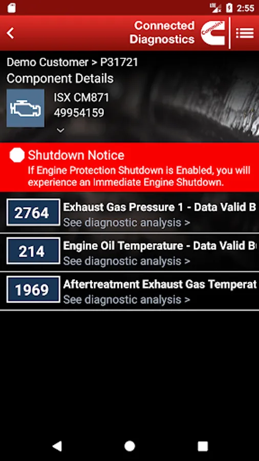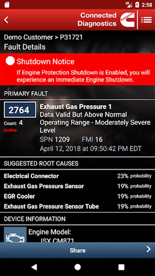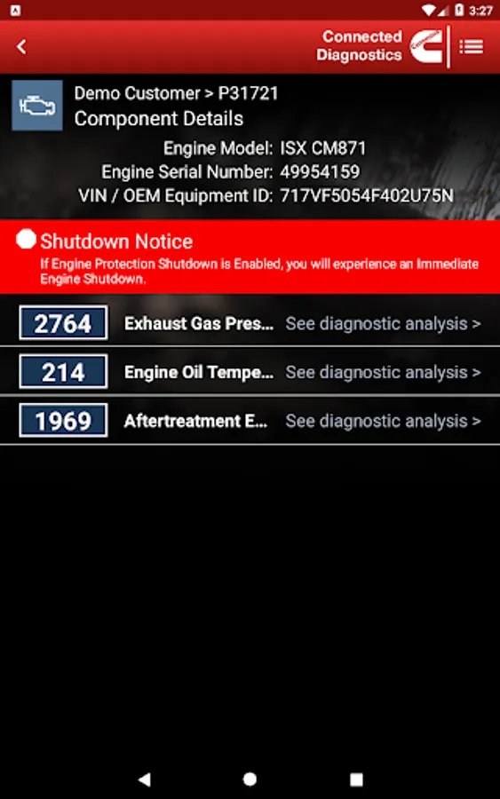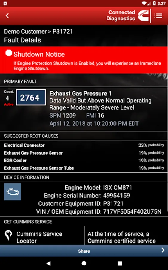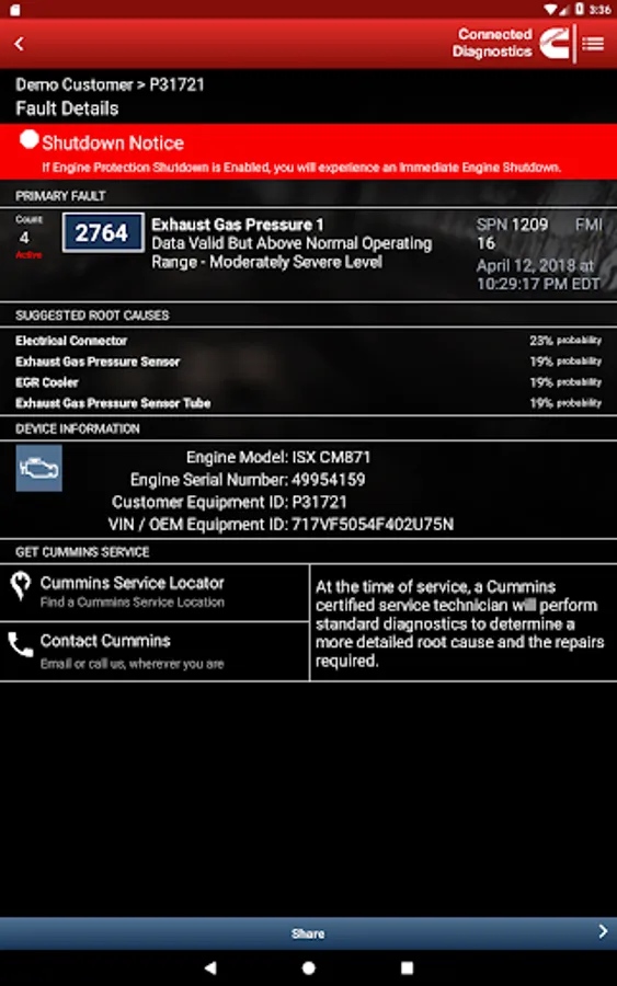 Connected Diagnostics™ uses the power of Cummins to analyze the fault code data, prioritizing all active and recently inactive faults to provide a high level of confidence that the recommendation to stop immediately or service immediately is the right one. Suggesting probable root cause of the fault to the component level, Connected Diagnostics™ facilitates the repair and minimizes downtime.
