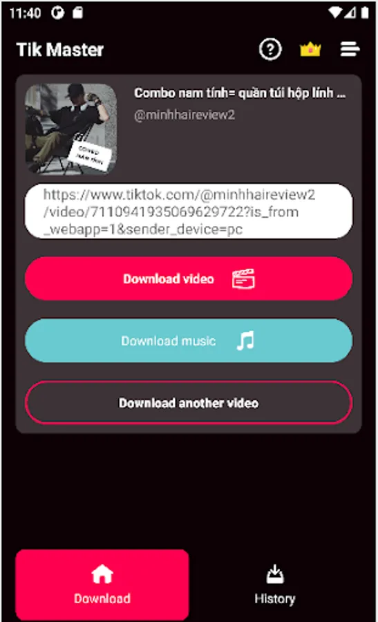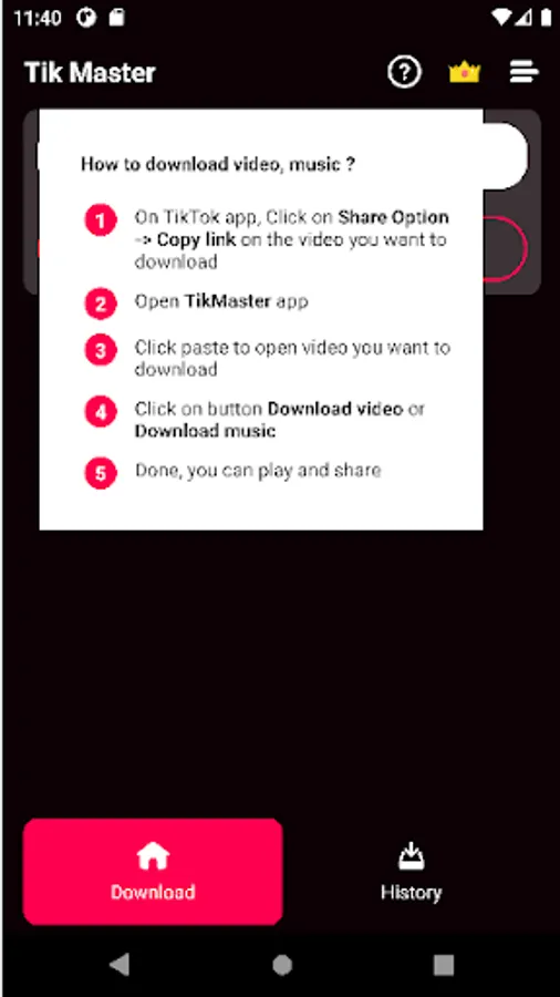 "Tik Master" is an easy app to download videos, photos from Tikt0k to the gallery and share ideas with your friends on Whatsapp, Facebook, Instagram, etc.