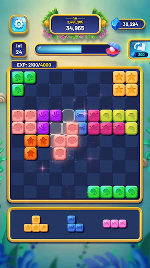 The traditional mechanics of well-known wood block puzzle games are preserved in Sea Block 1010 as well. Similar to playing a different block puzzle game, placing the block with the full line vertically or horizontally will make the block disappear and give you experience score. If your board is filled and you are unable to fill any more blocks, you will lose and cannot go on to the next level. As you go through the stages, collect gems to enable you to buy valuable boosters. In the challenging stage, you may also employ boosters for specialized support.