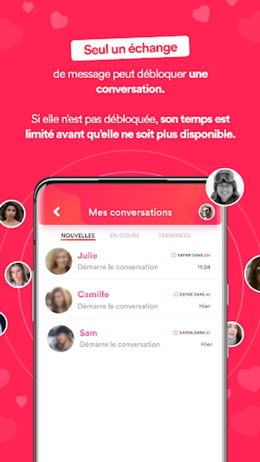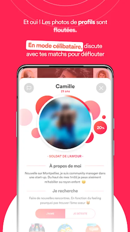 During your first exchanges, your photos are blurred. To discover what face is hidden behind your "match", you must dialogue, exchange, get to know each other. Tame you. Seduce you. Then finally, by mutual agreement, blur your photos. And meet you.