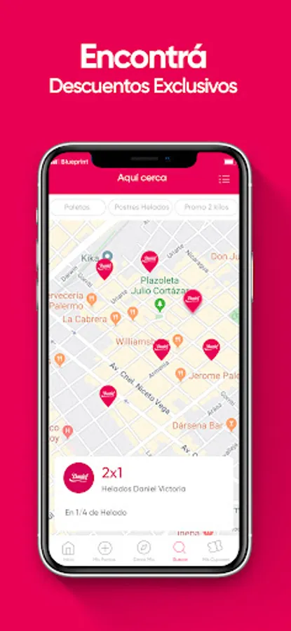 "Here near" will allow you to see the coupons near you and all the Daniel Ice Cream stores.