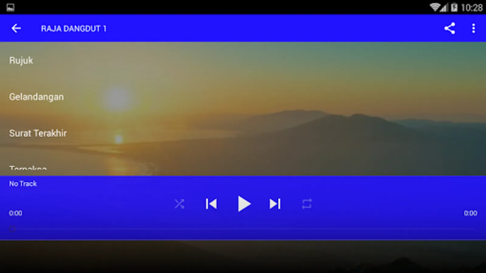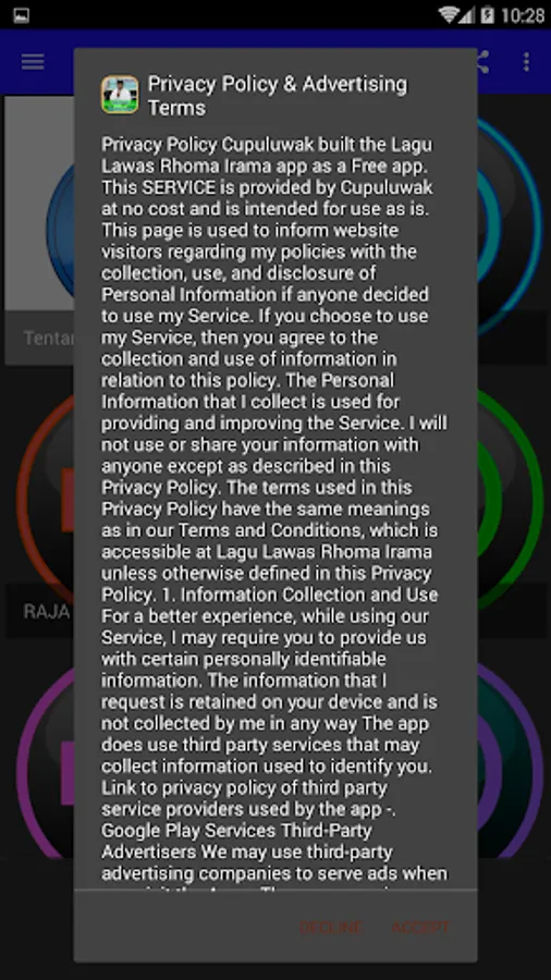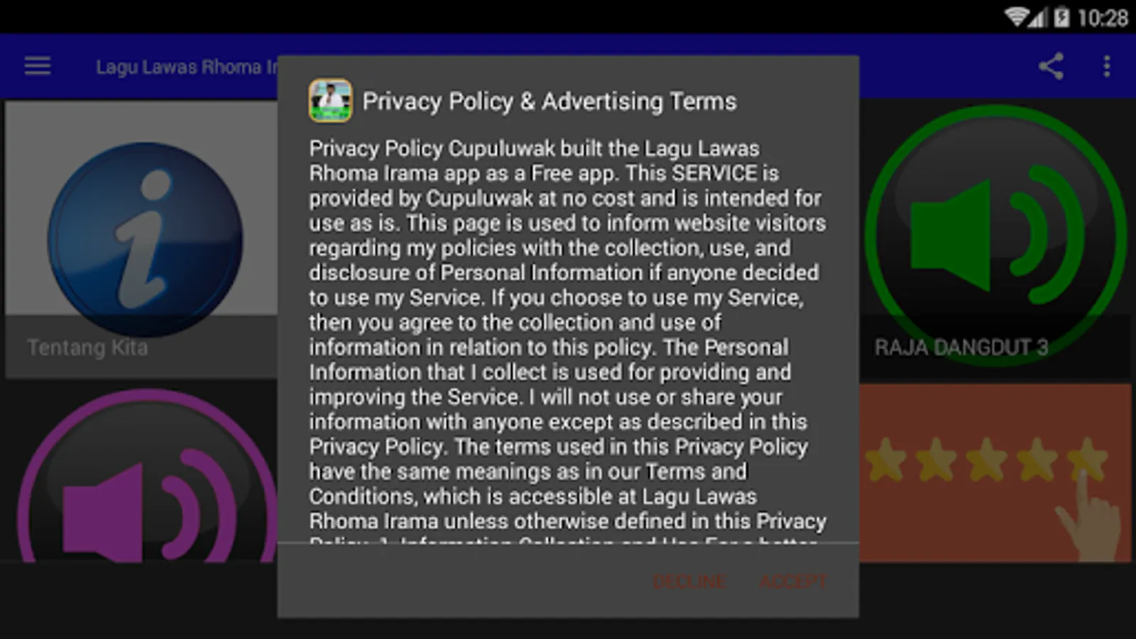 Going forward, we will constantly update the Legacy Songs Rhoma Irama. We wish all the friends always install the application so that we always have the support of all of them in developing this application. Hopefully Helpful for everything and congratulations use applications Lawas Rhoma Irama songs from your Android device, respectively. Thank you very much well.