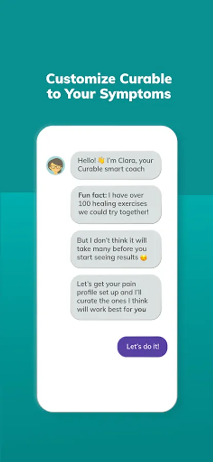 Get started on your Curable journey for free by chatting with our virtual coach, who will design a custom program tailored to your symptoms and preferences. During your journey, you’ll learn about the latest pain science through bite-sized audio lessons, then apply what you’ve learned using 100+ science-backed exercises for relief.