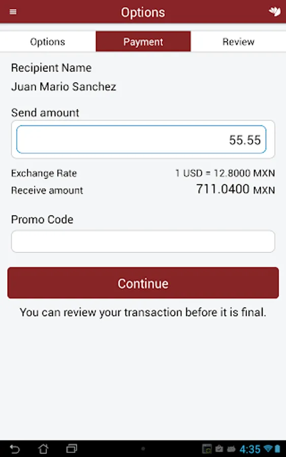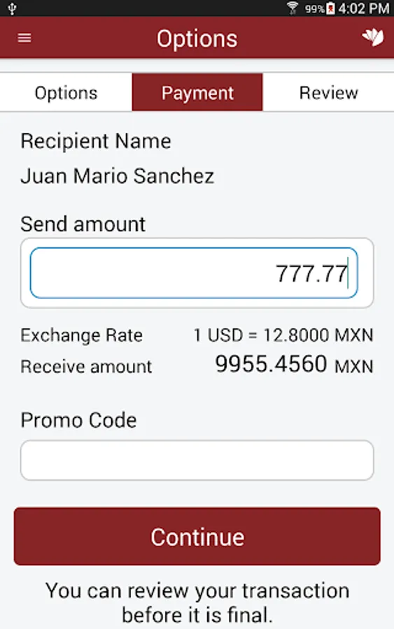 Transfer money securely and quickly with our app! With our easy-to-use interface, you can send money to Mexico, Central and South America at any time. Whether you need to send money to family or friends abroad, our service has got you covered. Our app uses the latest encryption technology to protect your transactions and personal information. Plus, our flat fee and competitive exchange rates mean you get more for your money. Say goodbye to high fees and hidden charges from traditional banks and transfer services.