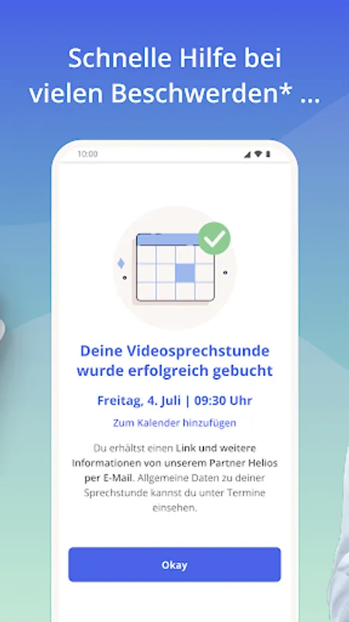 Book a doctor's appointment in just a few steps and get quick help on numerous health topics*. For the video chat you only need a mobile phone and a stable internet connection, of course it also works with a computer or tablet. Your health insurance covers the costs for the online video consultation.
