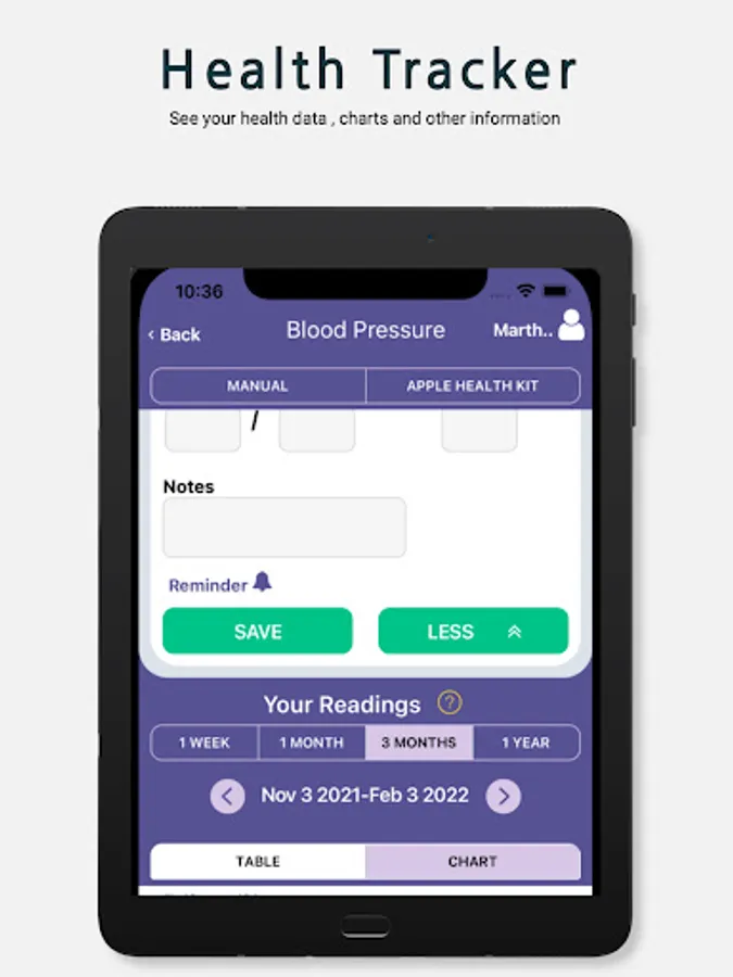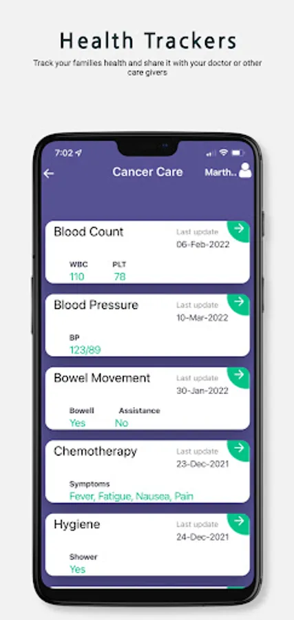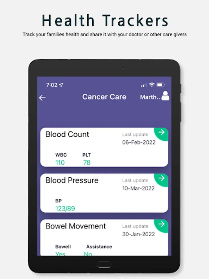 - Trackers help you manage your health conditions (including cancer, cardiac health, chronic disease, mental health, and elder care), share the information with your doctor(s) and/or care provider(s), view your health data in chronological order as well as see and monitor the trends over time with easy to view charts and tables. This app also allows you to have all of your health information in one convenient and reliable place.