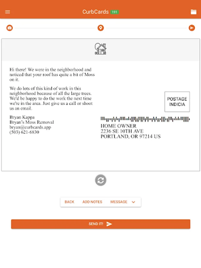 If you're a business, contractor, or if you do any kind of door-to-door sales outreach, CurbCards can help you out. Reach potential clients by sending personalized one-off direct mail pieces, right to someone's home.