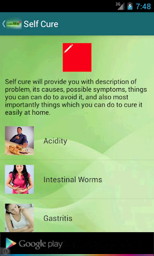 Ever wished 'I was a doctor' or 'I had doctor friend' o get instant medical advise. 'Cure Me' is your medical assistant. This Application provides tips for preventing and curing many health related problems. These tips have been recommended by Doctors and medical experts. These suggestions are mainly home remedies which do not require any kind of medicines. These suggestions are 100% effective, but if problem persist then do not hesitate to get in contact with your family doctor or our medical experts.