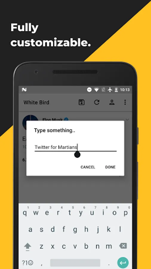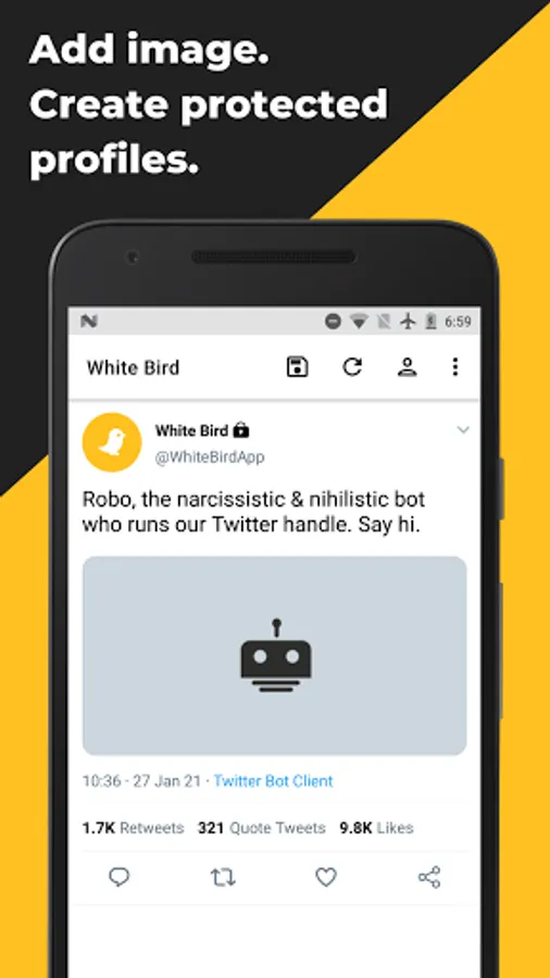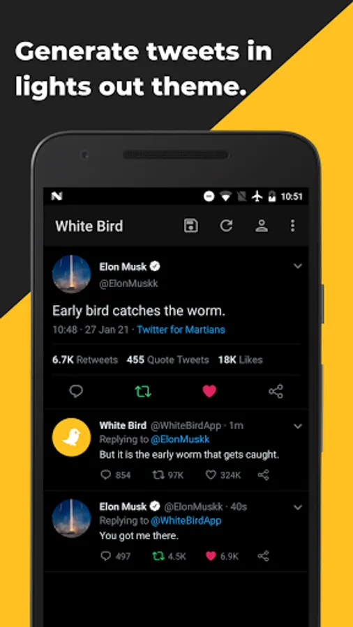 DISCLAIMER: White Bird is a free app whose sole purpose is to let users create custom tweets for entertainment purpose. TMM Lab, developer of White Bird shall not be liable for any misuse of the app by users. White Bird is not associated with Twitter.