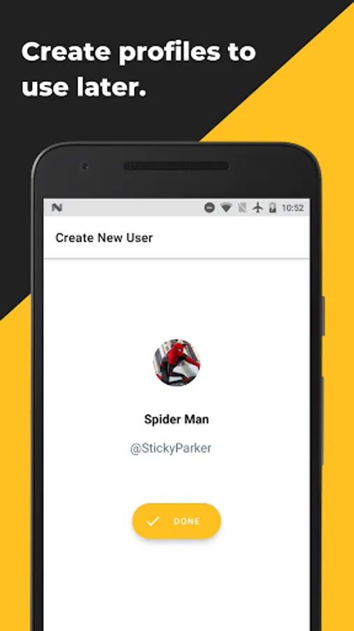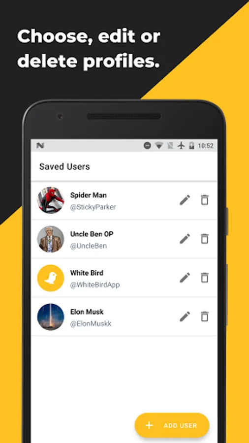 - Select profile avatar from gallery or saved users