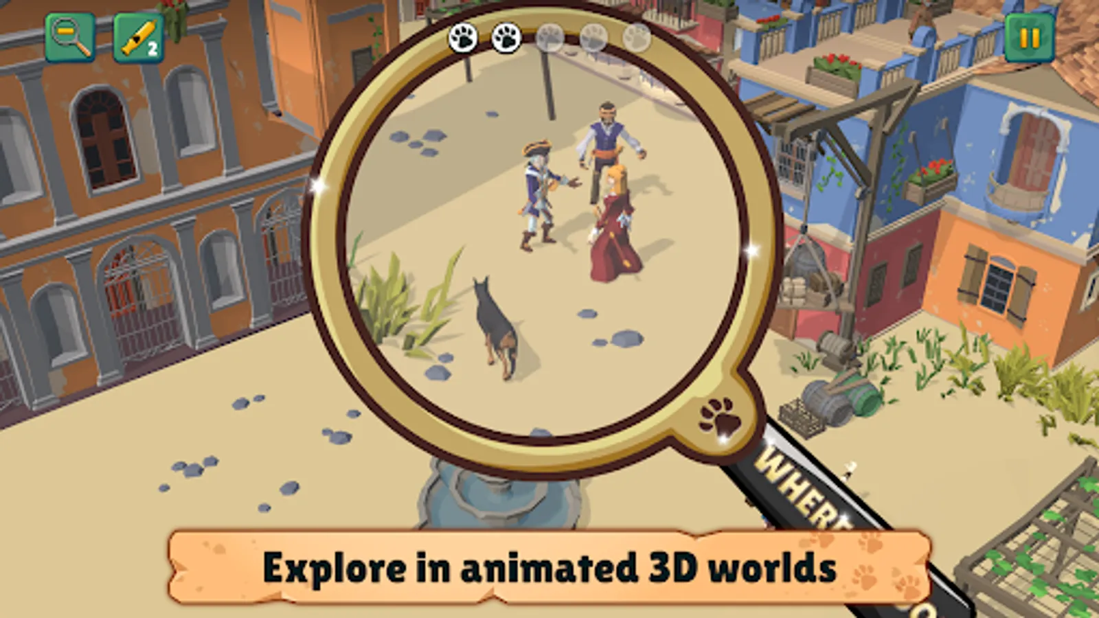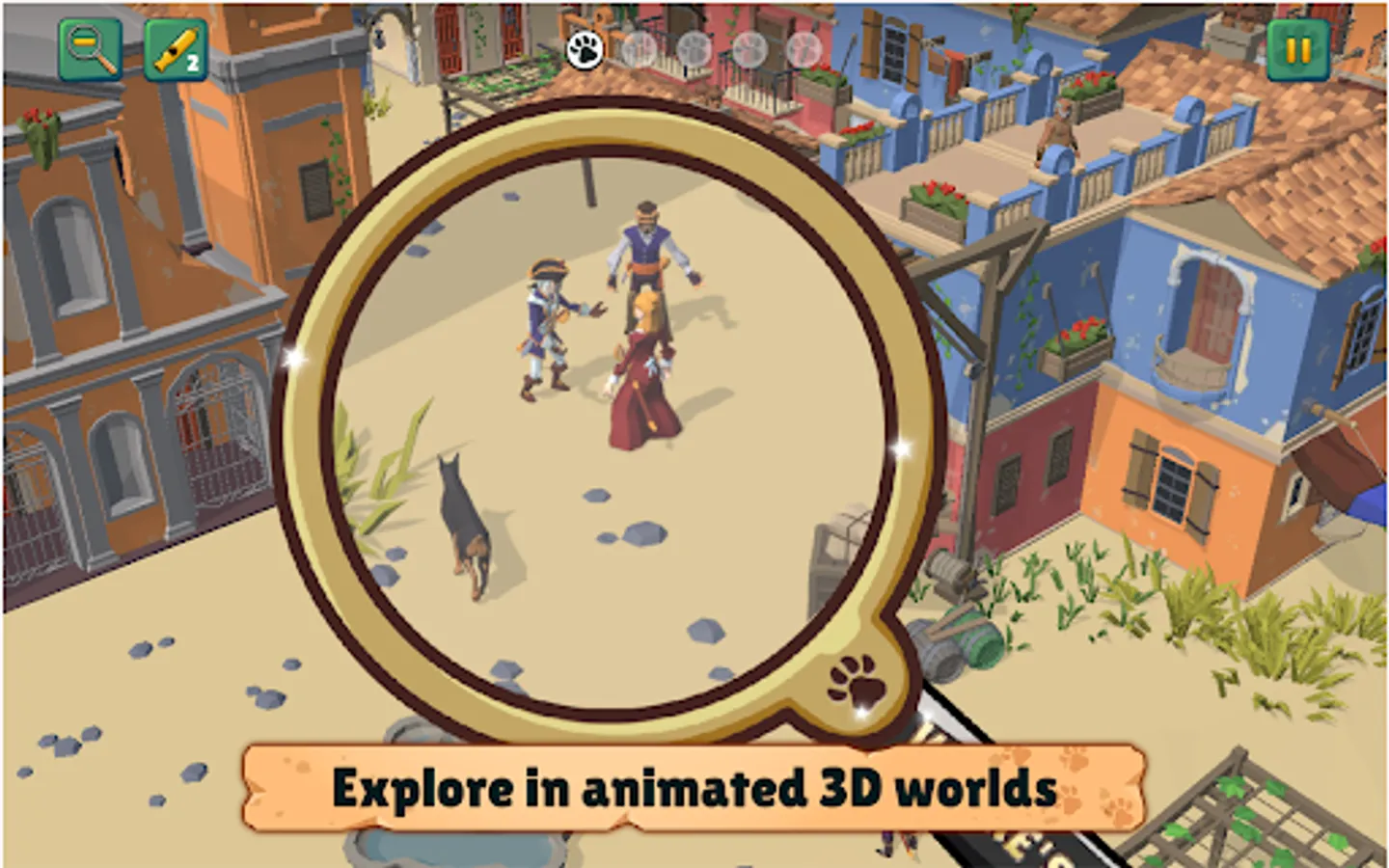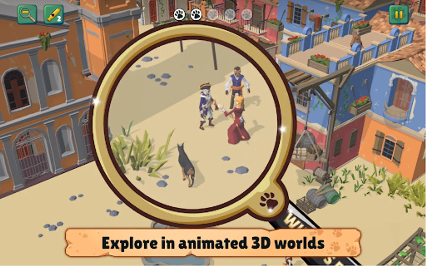 Take a closer look and discover all the wonderful details in the fun, animated 3D worlds. Is that a doggie in the window? Zoom in with the magnifying glass and find out! There are loads of levels to explore and with the sticker book to fill, you will have even more hidden objects to find! Join in on the search party fun and help bring the adorable furry friends home.