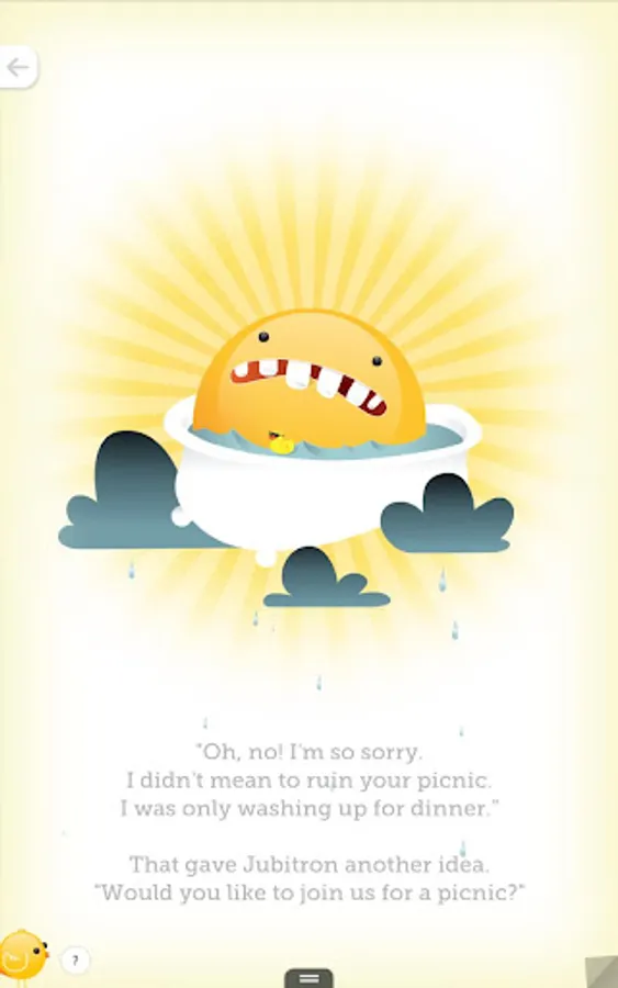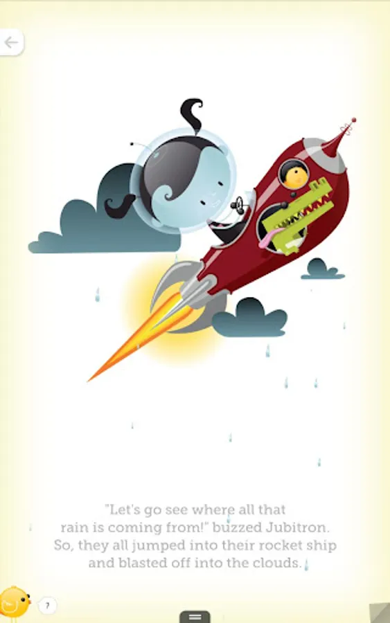 In this adventure Jubitron and her friends Mr. Alligator and Little Birdie decide to go on a lovely little picnic. But when their picnic is interrupted by a rain storm, Jubitorn has a bright idea and with the help of her friends (and a rocket ship) they save the day and make a new friend while they're at it.