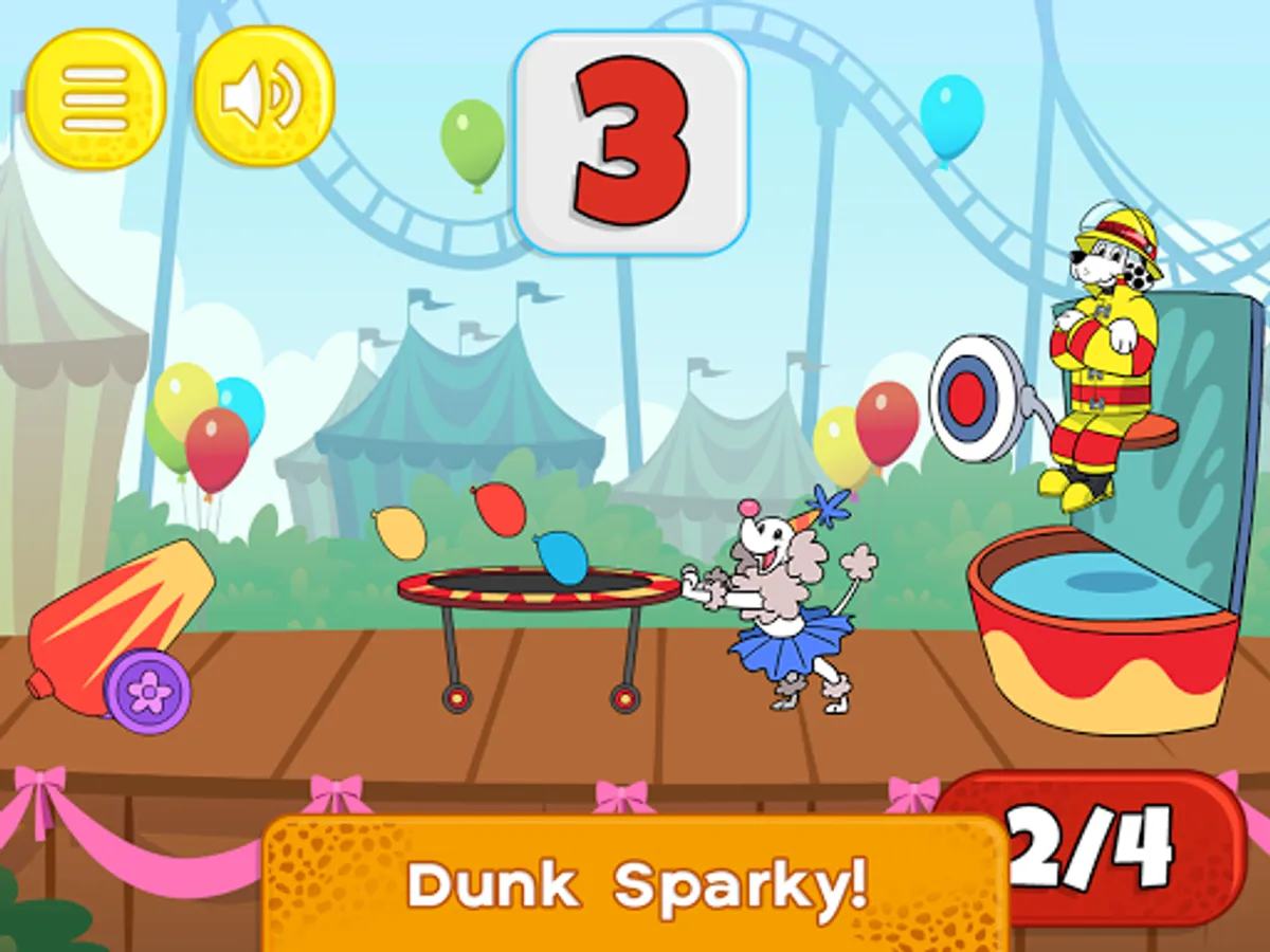 Once you help Sparky get outside safely, you'll unlock three fun mini-games. Toss balloons to dunk Sparky in the dunk tank, solve addition facts to squirt robots with water and send Sparky on a roller coaster ride by spelling words correctly!