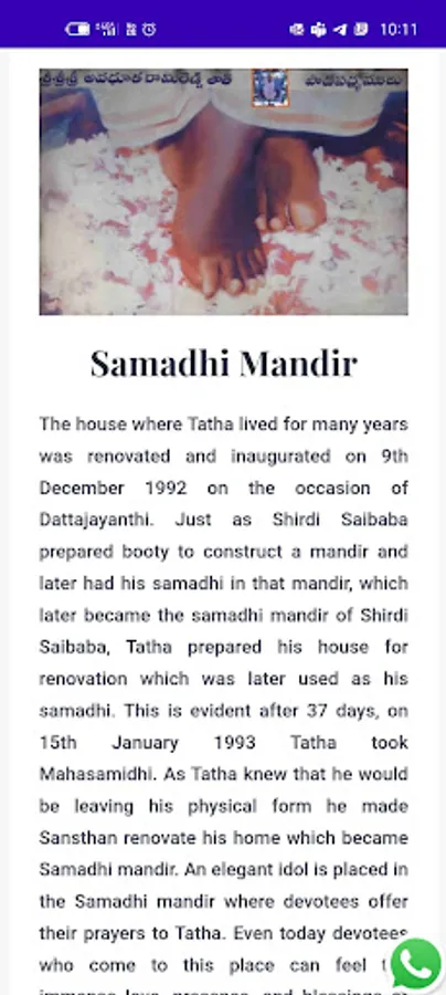 Blessed is the soil of Kallur which kissed the holy feet of the Tatha, blessed are the people who got an opportunity to live with him. Tatha embraced his devotees with love and affection, destroyed the karma of many people and elevated many lives of people who had immense faith and devotion for him. Tatha is not only an Avadhuta but also Sadguru who always gave his devotees the right things at right time and fulfill their desires. On the 15th of January 1993, Tatha took Mahasamidhi but Tatha has left only his physical form as his immortal body is always present to bless his devotees, show them the veracious path and protect them.