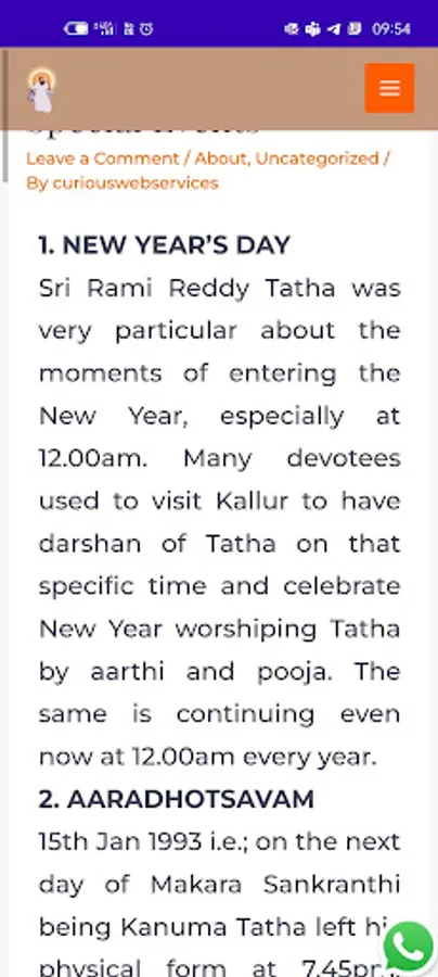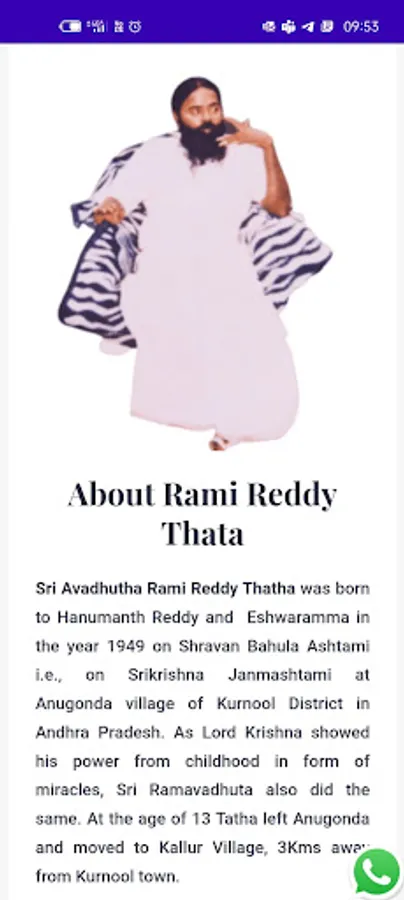Sri Avadhutha Rami Reddy Thatha was born to Hanumanth Reddy and Eshwaramma in the year 1949 on Shravan Bahula Ashtami i.e., on Srikrishna Janmashtami at Anugonda village of Kurnool District in Andhra Pradesh. As Lord Krishna showed his power from childhood in form of miracles, Sri Ramavadhuta also did the same. At the age of 13 Tatha left Anugonda and moved to Kallur Village, 3Kms away from Kurnool town.
