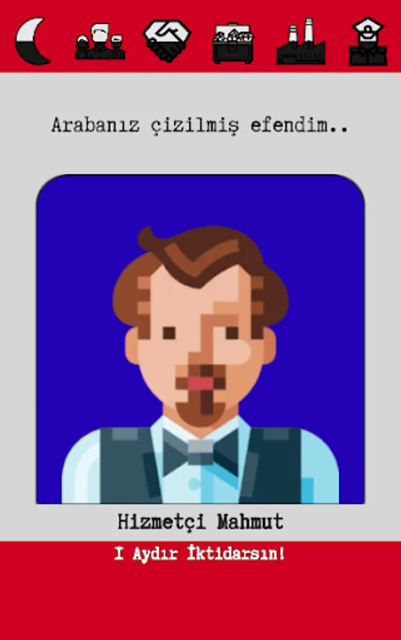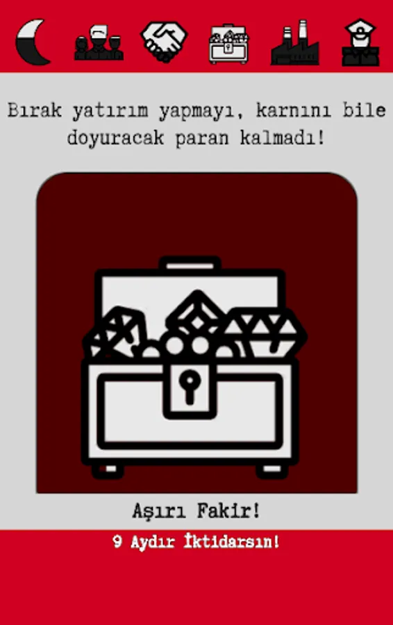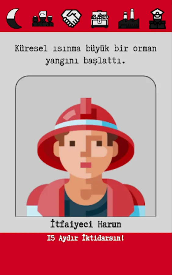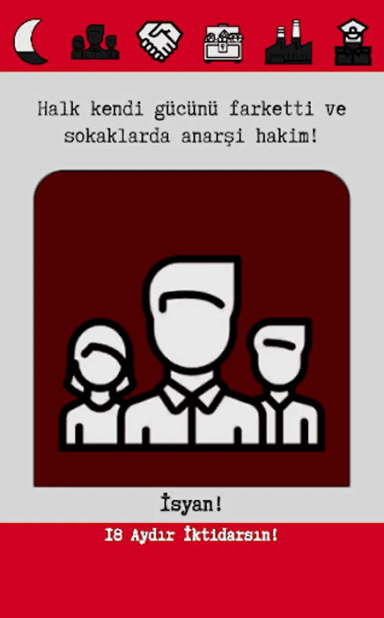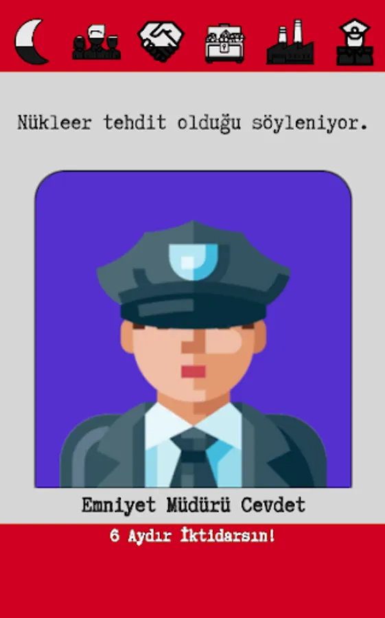 After choosing you president on the screen, a character appears every month and tells you a situation or asks a question. As the only manager of the country, you can pull these cards to the left or right and see the answer options written under the card. When you leave the card to the right, the answer to the right is the answer. When you leave it to the left, the answer to the left is accepted. When you pull the card to the right and left, all you need to pay attention to is the dots appear on the top icons when the answers appear. These points show which variables will affect the decision you are about to make (Religion, People, Allies, Treasury, Industry, Civil Forces) but it does not show how much these variables will change. You should consider this as you answer and make your decisions carefully. The aim is to stay in power for the longest time. After finishing, if you are logged in (black icon in the main menu) your score and achievements in the game are kept. In this way, you can fight people in the ranking. Get over now!