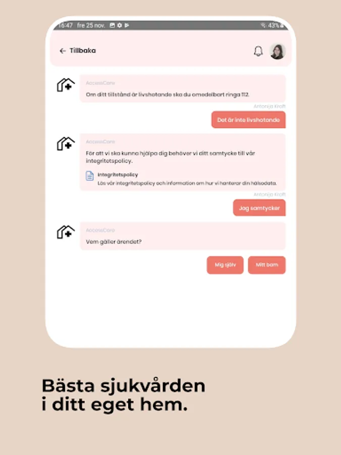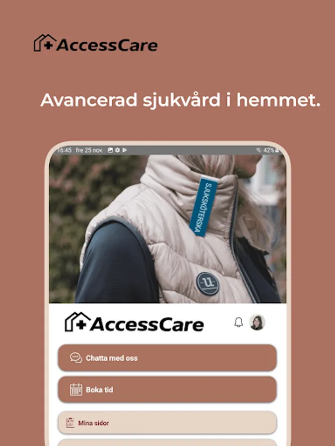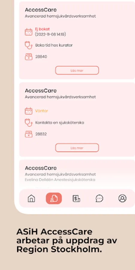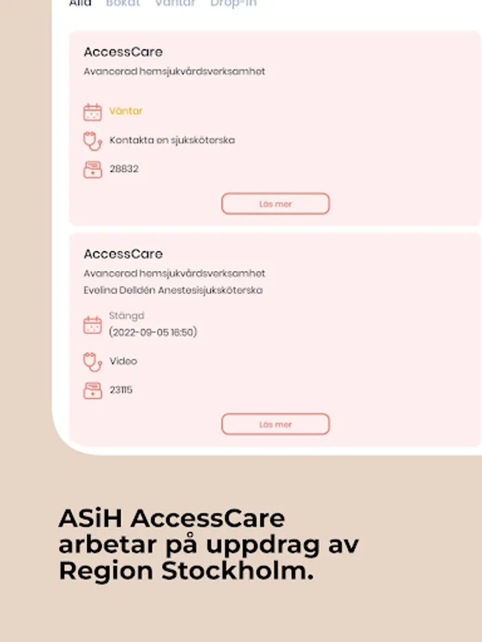 AccessCare ASiH is a healthcare provider that works on behalf of Region Stockholm. The care is directed to the patient with a serious medical condition that requires connection to a care provider around the clock. Within AccessCare, a team of doctors, nurses, dietician, physiotherapist, occupational therapist and counselor work.
