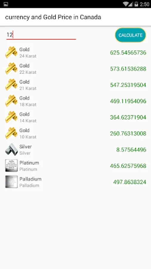 you can input metal Weight in gram to calculate price Gold Karat from 24 to 10 karat , Silver , palladium and platinum in one click for all