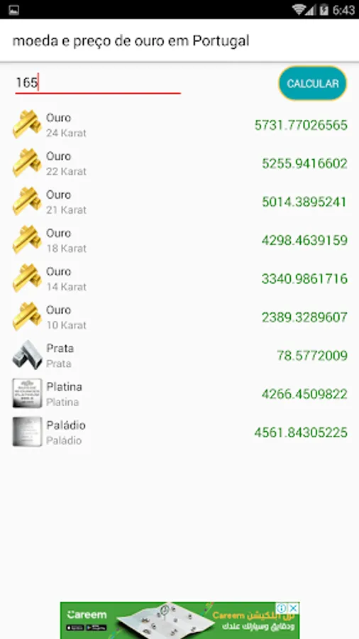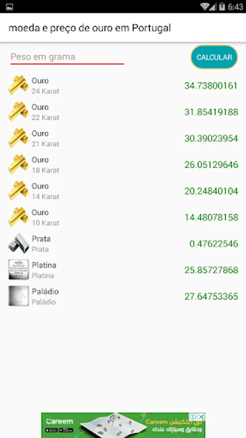 you can insert metal Weight in gram to calculate the price Gold Karat from 24 to 10 carats, silver, palladium and platinum in one click for all
