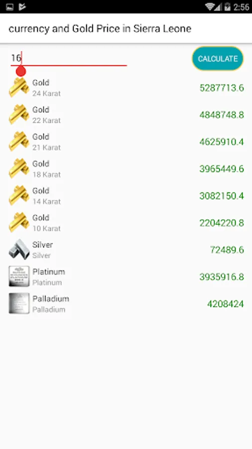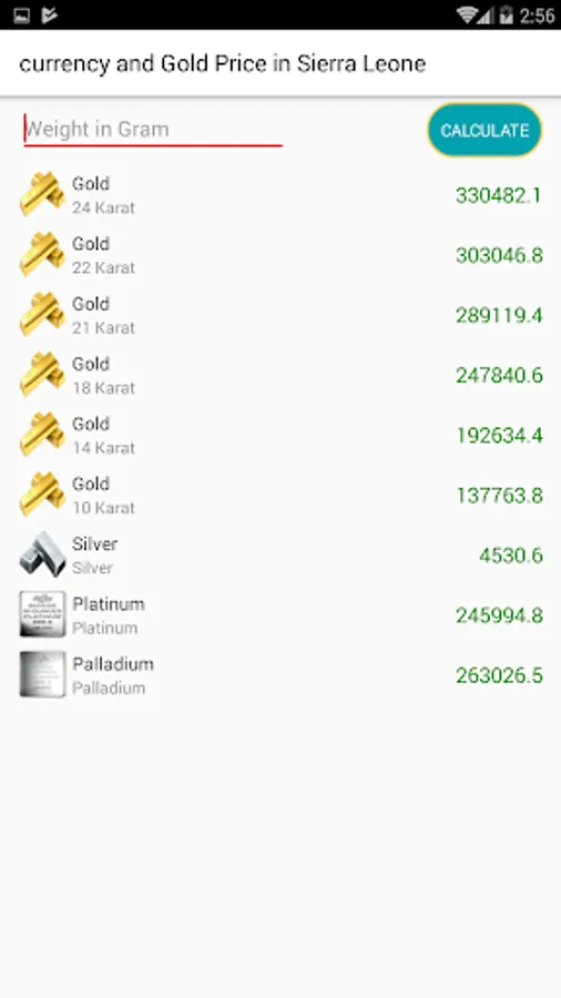 you can calculate gold and metal gram to Sierra Leonean Leone in one click