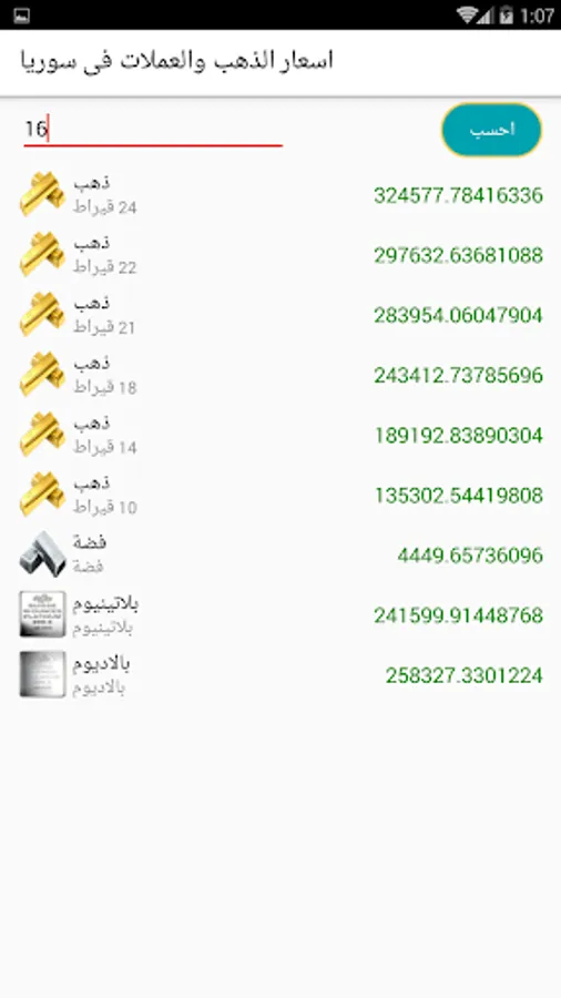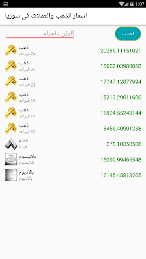 You can also calculate the weight of gold, silver and metals once you enter the weight you want to calculate the application of gold prices and currencies in Syria showing the output of gold 24, 22, 21, 18, 14 and 10, silver and palladium and platinum