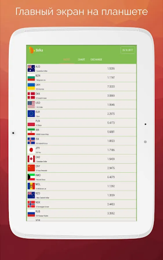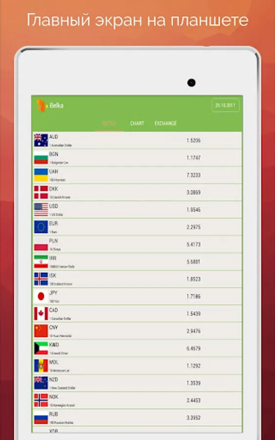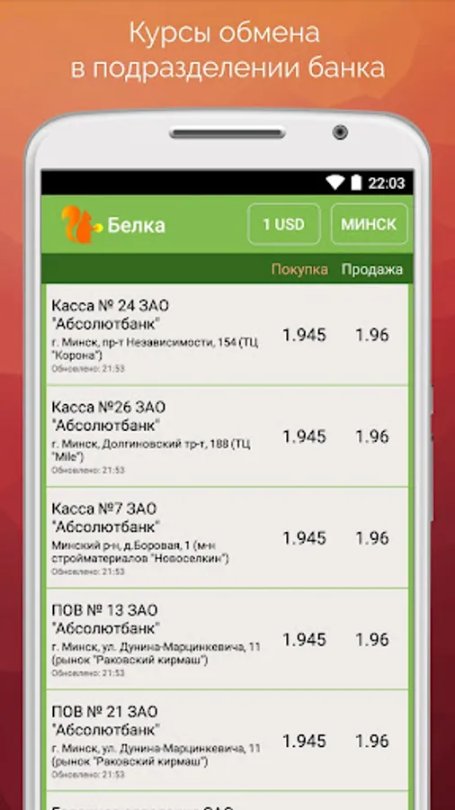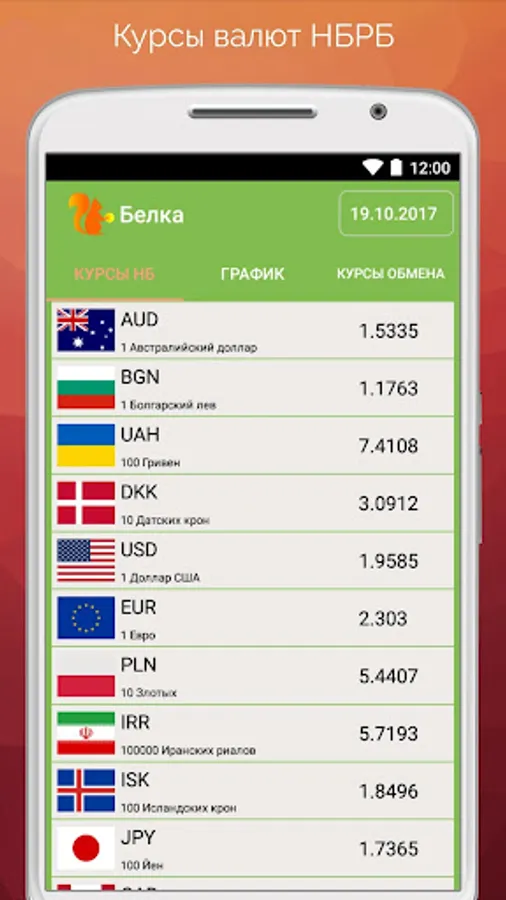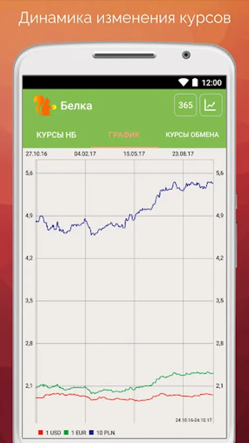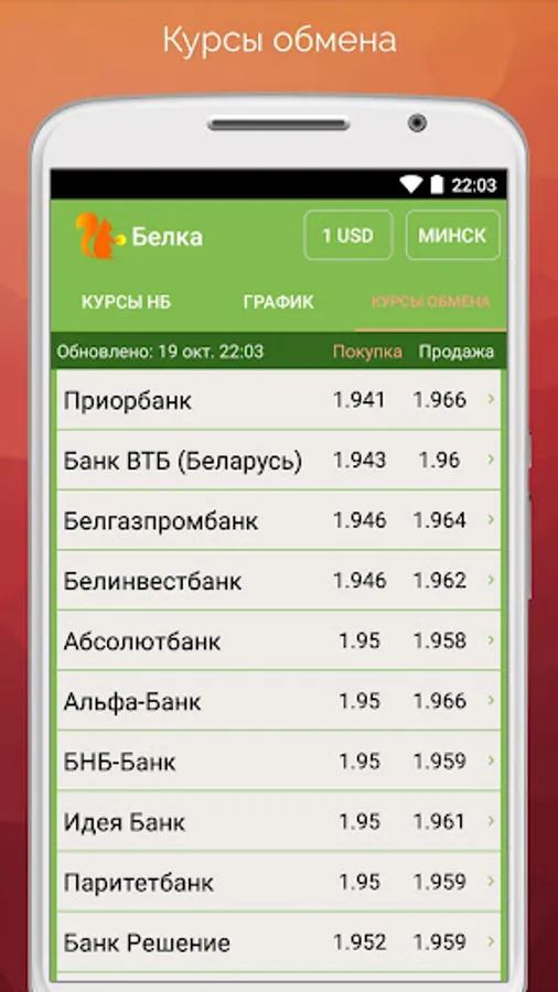 Protein in the course of recent data banks. Convenient concise app allows you to see the current exchange rates of banks in Minsk, Brest, Vitebsk, Grodno, Gomel, Mogilev and choose the best. Belka also show information about the exchange rates of the National Bank for many days, months or even years. Course change statistics are displayed on the graph. The application has a handy widget that will decorate your phone screen and will always keep you up to date with the latest currency movements. Be like "Squirrel" - be aware.